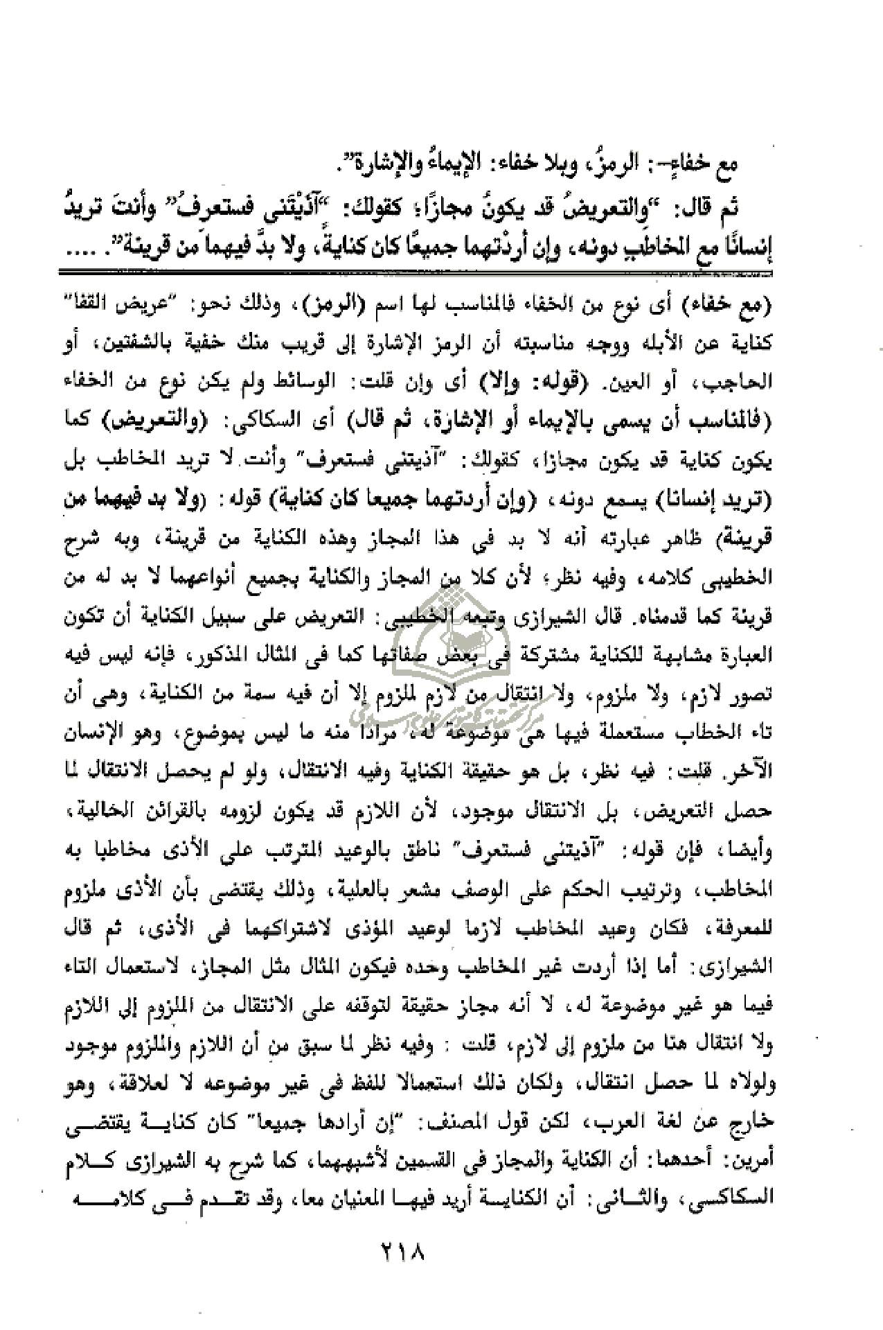 (مع خفاء) أى نوع من الخفاء فالمناسب لها اسم (الرمز)، وذلك نحو:" عريض القفا" كناية عن الأبله ووجه مناسبته أن الرمز الإشارة إلى قريب منك خفية بالشفتين، أو الحاجب، أو العين. (قوله: وإلا) أى وإن قلت: الوسائط ولم يكن نوع من الخفاء (فالمناسب أن يسمى بالإيماء أو الإشارة، ثم قال) أى السكاكى: (والتعريض) كما يكون كناية قد يكون مجازا، كقولك:" آذيتنى فستعرف" وأنت لا تريد المخاطب بل (تريد إنسانا) يسمع دونه، (وإن أردتهما جميعا كان كناية) قوله: (ولا بد فيهما من قرينة) ظاهر عبارته أنه لا بد فى هذا المجاز وهذه الكناية من قرينة، وبه شرح الخطيبى كلامه، وفيه نظر؛ لأن كلا من المجاز والكناية بجميع أنواعهما لا بد له من قرينة كما قدمناه. قال الشيرازى وتبعه الخطيبى: التعريض على سبيل الكناية أن تكون العبارة مشابهة للكناية مشتركة فى بعض صفاتها كما فى المثال المذكور، فإنه ليس فيه تصور لازم، ولا ملزوم، ولا انتقال من لازم لملزوم إلا أن فيه سمة من الكناية، وهى أن تاء الخطاب مستعملة فيها هى موضوعة له، مرادا منه ما ليس بموضوع، وهو الإنسان الآخر. قلت: فيه نظر، بل هو حقيقة الكناية وفيه الانتقال، ولو لم يحصل الانتقال لما حصل التعريض، بل الانتقال موجود، لأن اللازم قد يكون لزومه بالقرائن الحالية، وأيضا، فإن قوله:" آذيتنى فستعرف" ناطق بالوعيد المترتب على الأذى مخاطبا به المخاطب، وترتيب الحكم على الوصف مشعر بالعلية، وذلك يقتضى بأن الأذى ملزوم للمعرفة، فكان وعيد المخاطب لازما لوعيد المؤذى لاشتراكهما فى الأذى، ثم قال الشيرازى: أما إذا أردت غير المخاطب وحده فيكون المثال مثل المجاز، لاستعمال التاء فيما هو غير موضوعة له، لا أنه مجاز حقيقة لتوقفه على الانتقال من الملزوم إلى اللازم ولا انتقال هنا من ملزوم إلى لازم، قلت: وفيه نظر لما سبق من أن اللازم والملزوم موجود ولولاه لما حصل انتقال، ولكان ذلك استعمالا للفظ فى غير موضوعه لا لعلاقة، وهو خارج عن لغة العرب، لكن قول المصنف:" إن أرادها جميعا" كان كناية يقتضى أمرين: أحدهما: أن الكناية والمجاز فى القسمين لأشبههما، كما شرح به الشيرازى كلام السكاكى، والثانى: أن الكناية أريد فيها المعنيان معا، وقد تقدم فى كلامه