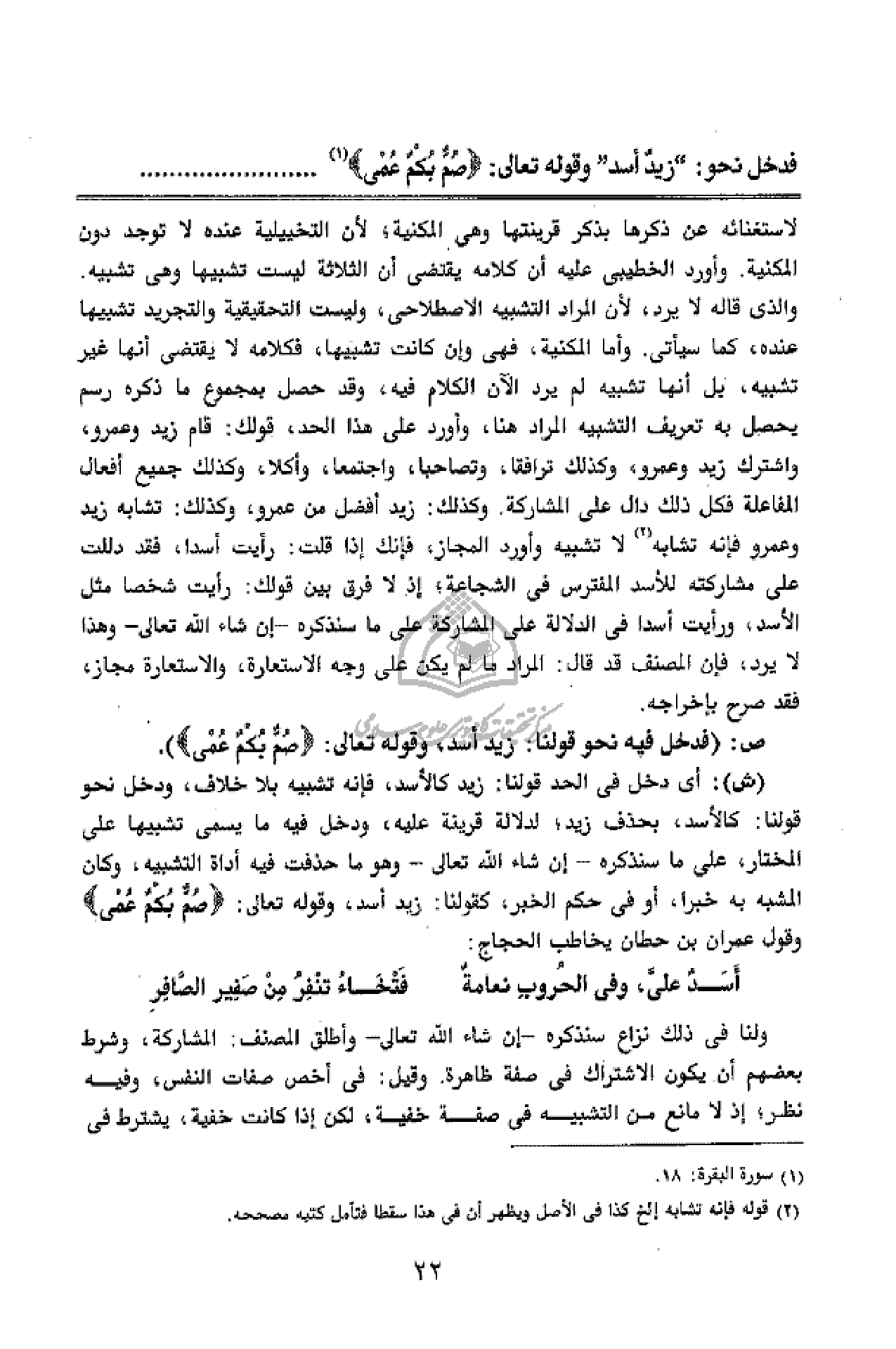ص: (فدخل فيه نحو قولنا: زيد أسد، وقوله تعالى: صُمٌّ بُكْمٌ عُمْيٌ).