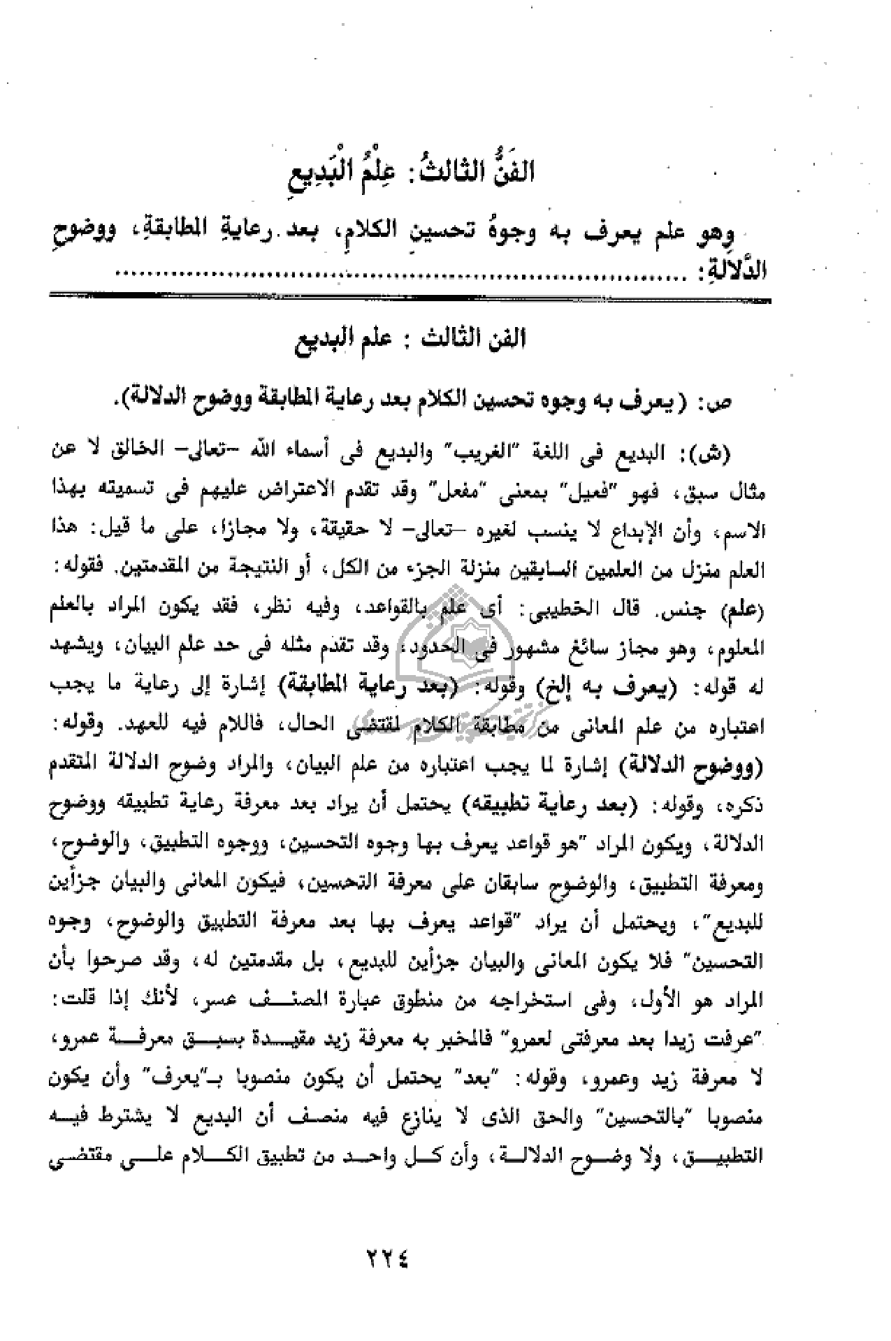 الفن الثالث: علم البديع ص: (يعرف به وجوه تحسين الكلام بعد رعاية المطابقة ووضوح الدلالة).