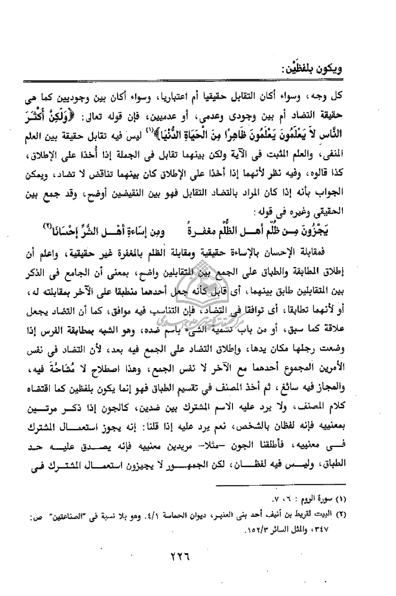 فمقابلة الإحسان بالإساءة حقيقية ومقابلة الظلم بالمغفرة غير حقيقية، واعلم أن إطلاق المطابقة والطباق على الجمع بين المتقابلين واضح، بمعنى أن الجامع فى الذكر بين المتقابلين طابق بينهما، أى قابل كأنه جعل أحدهما منطبقا على الآخر بمقابلته له، أو لأنهما تطابقا، أى توافقا فى التضاد، فإن التناسب فيه موافق، كما أن التضاد يجعل علاقة كما سبق، أو من باب تسمية الشئ باسم ضده، وهو الشبه بمطابقة الفرس إذا وضعت رجلها مكان يدها، وإطلاق التضاد على الجمع فيه بعد، لأن التضاد فى نفس الأمرين المجموع أحدهما مع الآخر لا نفس الجمع، وهذا اصطلاح لا مشاحّة فيه، والمجاز فيه سائغ، ثم أخذ المصنف فى تقسيم الطباق فهو إنما يكون بلفظين كما اقتضاه كلام المصنف، ولا يرد عليه الاسم المشترك بين ضدين، كالجون إذا ذكر مرتين بمعنييه فإنه لفظان بالشخص، نعم يرد عليه إذا قلنا: إنه يجوز استعمال المشترك فى معنييه، فأطلقنا الجون - مثلا - مريدين معنييه فإنه يصدق عليه حد الطباق، وليس فيه لفظان، لكن الجمهور لا يجيزون استعمال المشترك فى