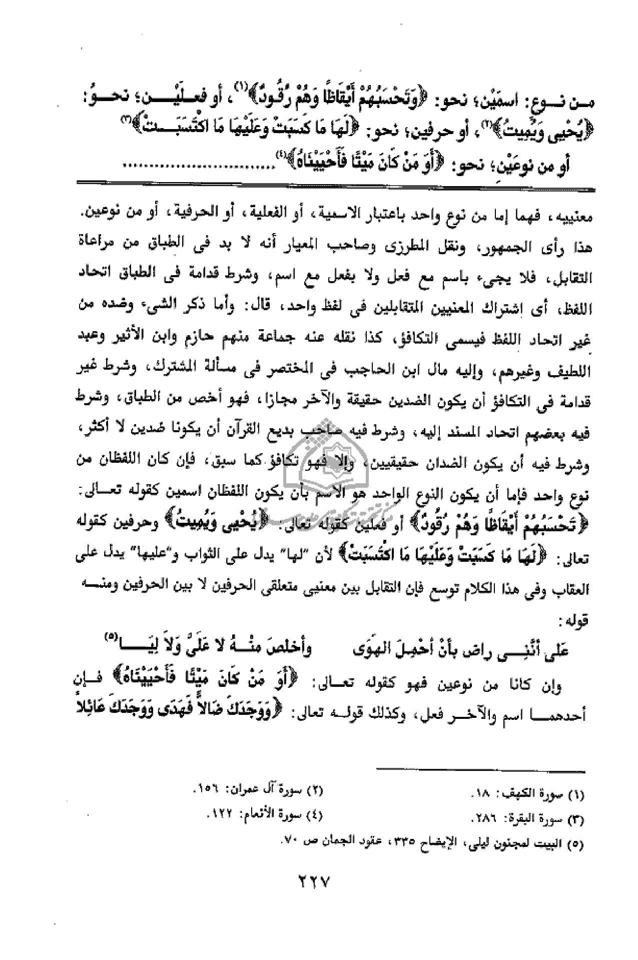 تَحْسَبُهُمْ أَيْقاظاً وَهُمْ رُقُودٌ أو فعلين كقوله تعالى: يُحْيِي وَيُمِيتُ وحرفين كقوله تعالى: لَها ما كَسَبَتْ وَعَلَيْها مَا اكْتَسَبَتْ لأن" لها" يدل على الثواب و" عليها" يدل على العقاب وفى هذا الكلام توسع فإن التقابل بين معنيى متعلقى الحرفين لا بين الحرفين ومنه قوله: