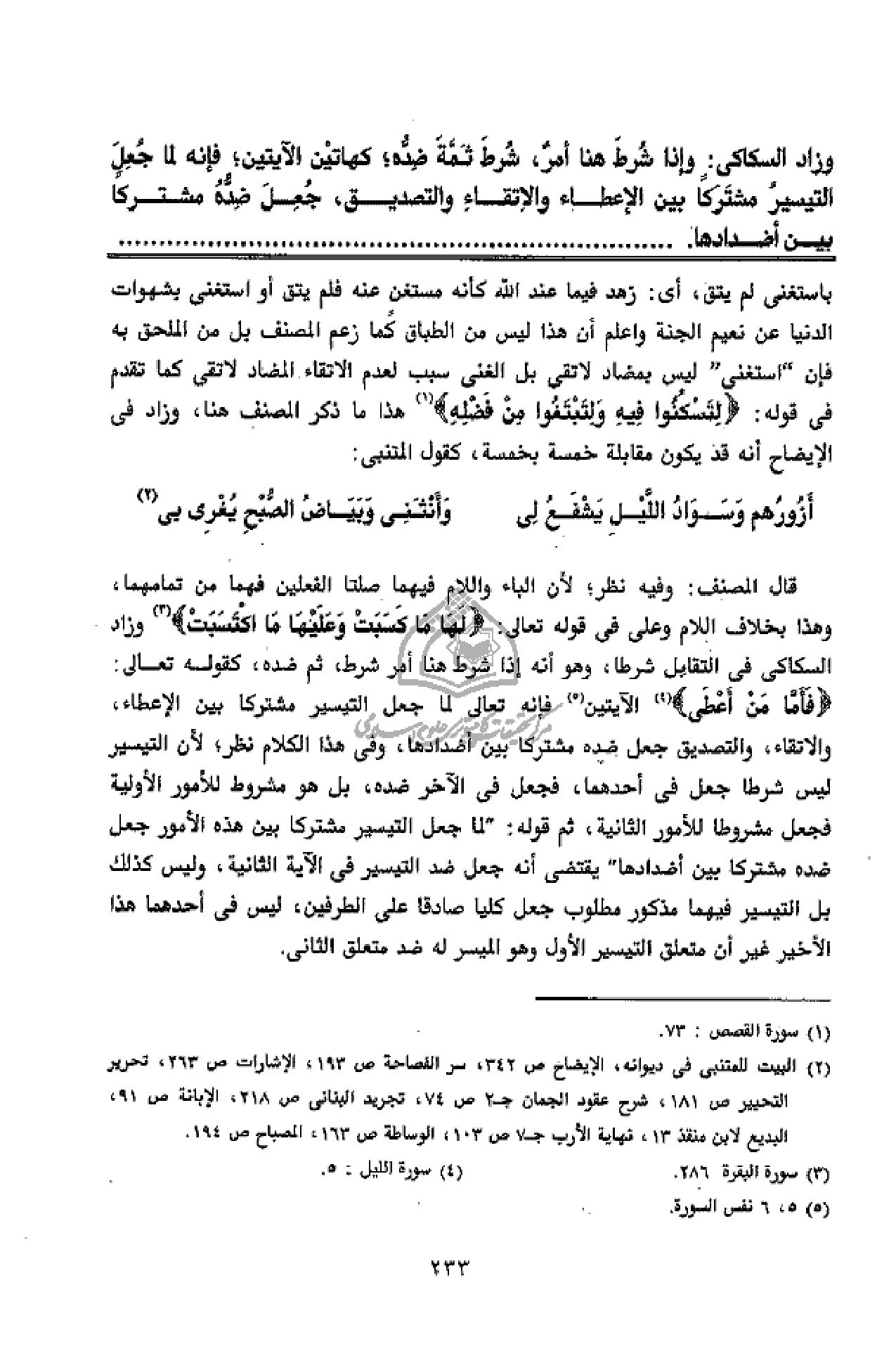 وزاد السكاكى: وإذا شرط هنا أمر، شرط ثمّة ضدّه؛ كهاتين الآيتين؛ فإنه لما جعل التيسير مشتركا بين الإعطاء والاتقاء والتصديق، جعل ضدّه مشتركا بين أضدادها.