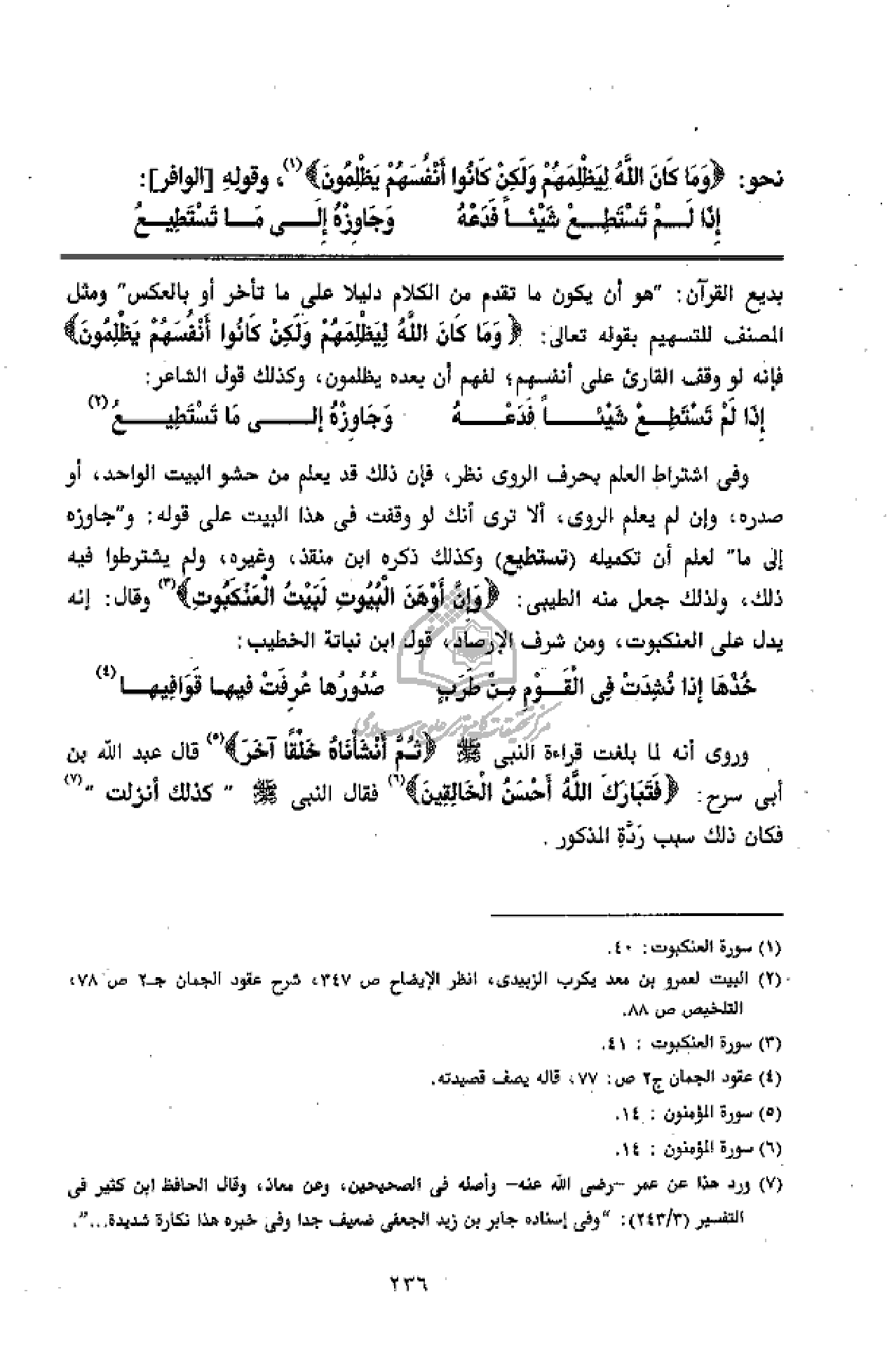 وفى اشتراط العلم بحرف الروى نظر، فإن ذلك قد يعلم من حشو البيت الواحد، أو صدره، وإن لم يعلم الروى، ألا ترى أنك لو وقفت فى هذا البيت على قوله: و" جاوزه إلى ما" لعلم أن تكميله (تستطيع) وكذلك ذكره ابن منقذ، وغيره، ولم يشترطوا فيه ذلك، ولذلك جعل منه الطيبى: وَإِنَّ أَوْهَنَ الْبُيُوتِ لَبَيْتُ الْعَنْكَبُوتِ (¬3) وقال: إنه يدل على العنكبوت، ومن شرف الإرصاد، قول ابن نباتة الخطيب: