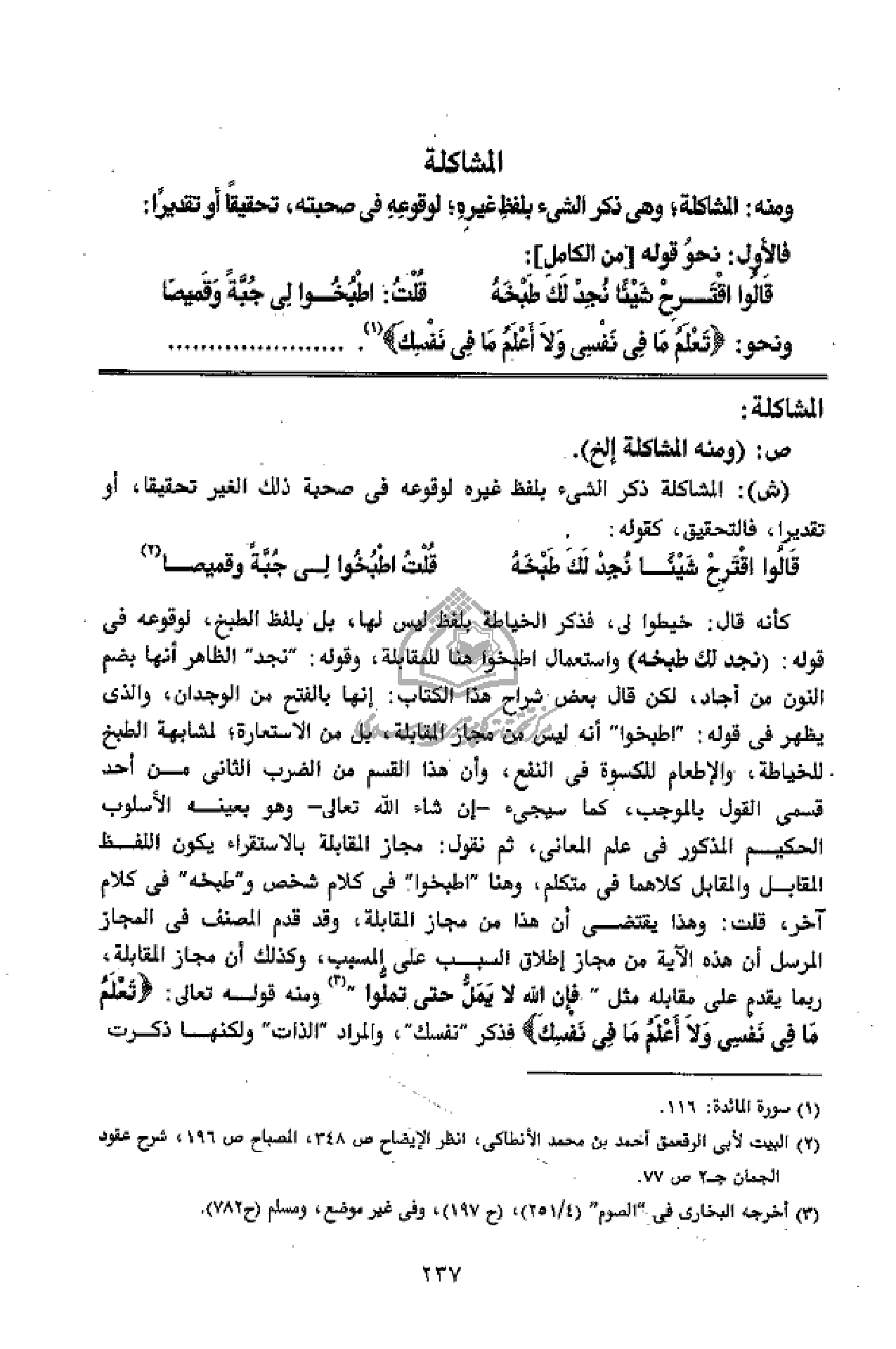 (ش): المشاكلة ذكر الشئ بلفظ غيره لوقوعه فى صحبة ذلك الغير تحقيقا، أو تقديرا، فالتحقيق، كقوله: