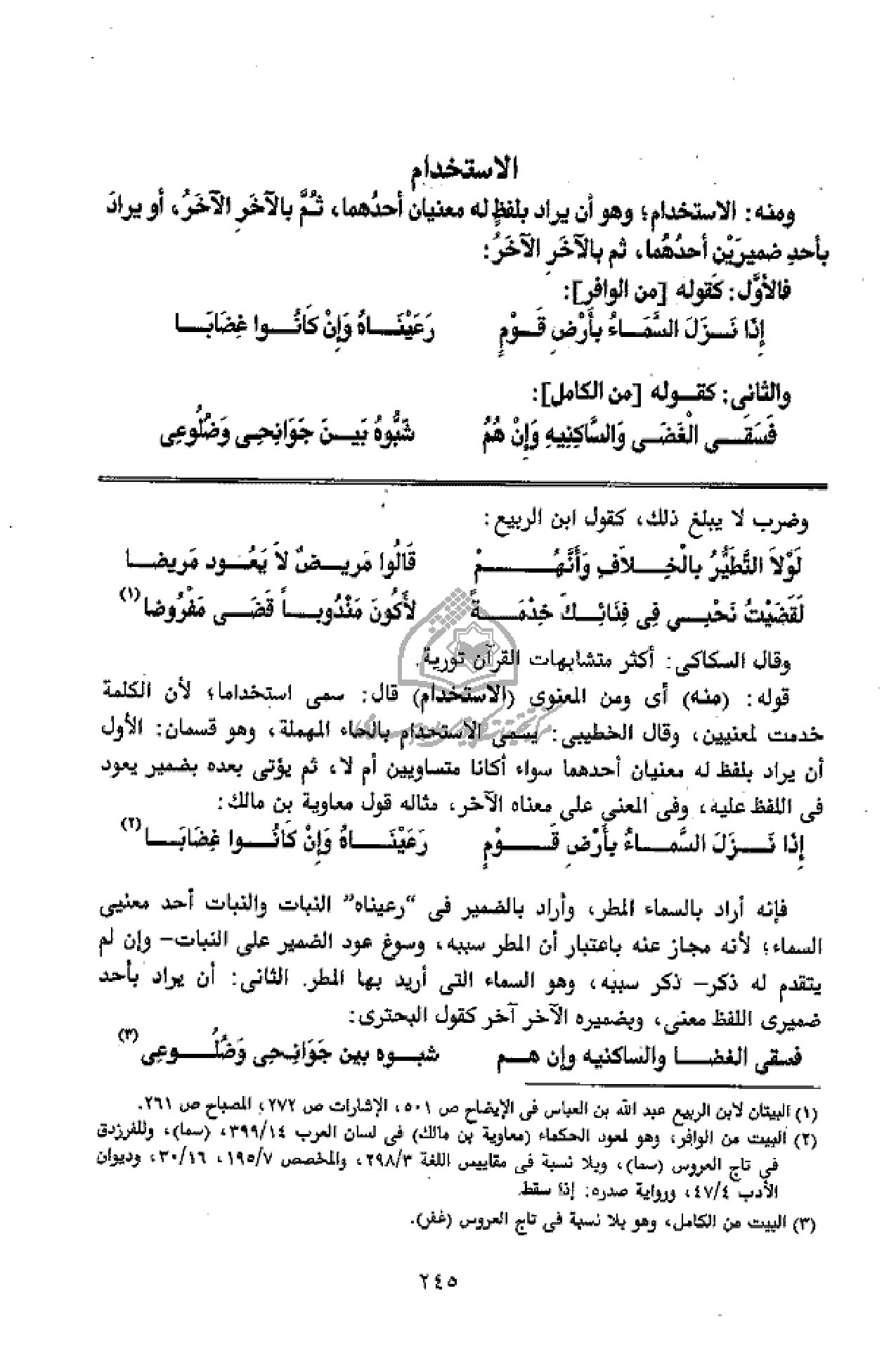 ومنه: الاستخدام؛ وهو أن يراد بلفظ له معنيان أحدهما، ثمّ بالآخر الآخر، أو يراد بأحد ضميرين أحدهما، ثم بالآخر الآخر: