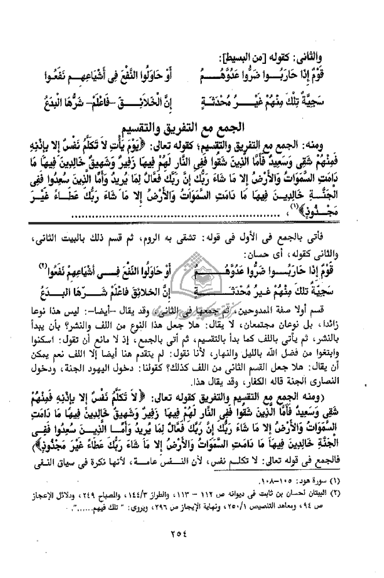 (ومنه الجمع مع التقسيم والتفريق كقوله تعالى: لا تَكَلَّمُ نَفْسٌ إِلَّا بِإِذْنِهِ فَمِنْهُمْ شَقِيٌّ وَسَعِيدٌ فَأَمَّا الَّذِينَ شَقُوا فَفِي النَّارِ لَهُمْ فِيها زَفِيرٌ وَشَهِيقٌ خالِدِينَ فِيها ما دامَتِ السَّماواتُ وَالْأَرْضُ إِلَّا ما شاءَ رَبُّكَ إِنَّ رَبَّكَ فَعَّالٌ لِما يُرِيدُ وَأَمَّا الَّذِينَ سُعِدُوا فَفِي الْجَنَّةِ خالِدِينَ فِيها ما دامَتِ السَّماواتُ وَالْأَرْضُ إِلَّا ما شاءَ رَبُّكَ عَطاءً غَيْرَ مَجْذُوذٍ) فالجمع فى قوله تعالى: لا تكلم نفس، لأن النفس عامة، لأنها نكرة فى سياق النفى