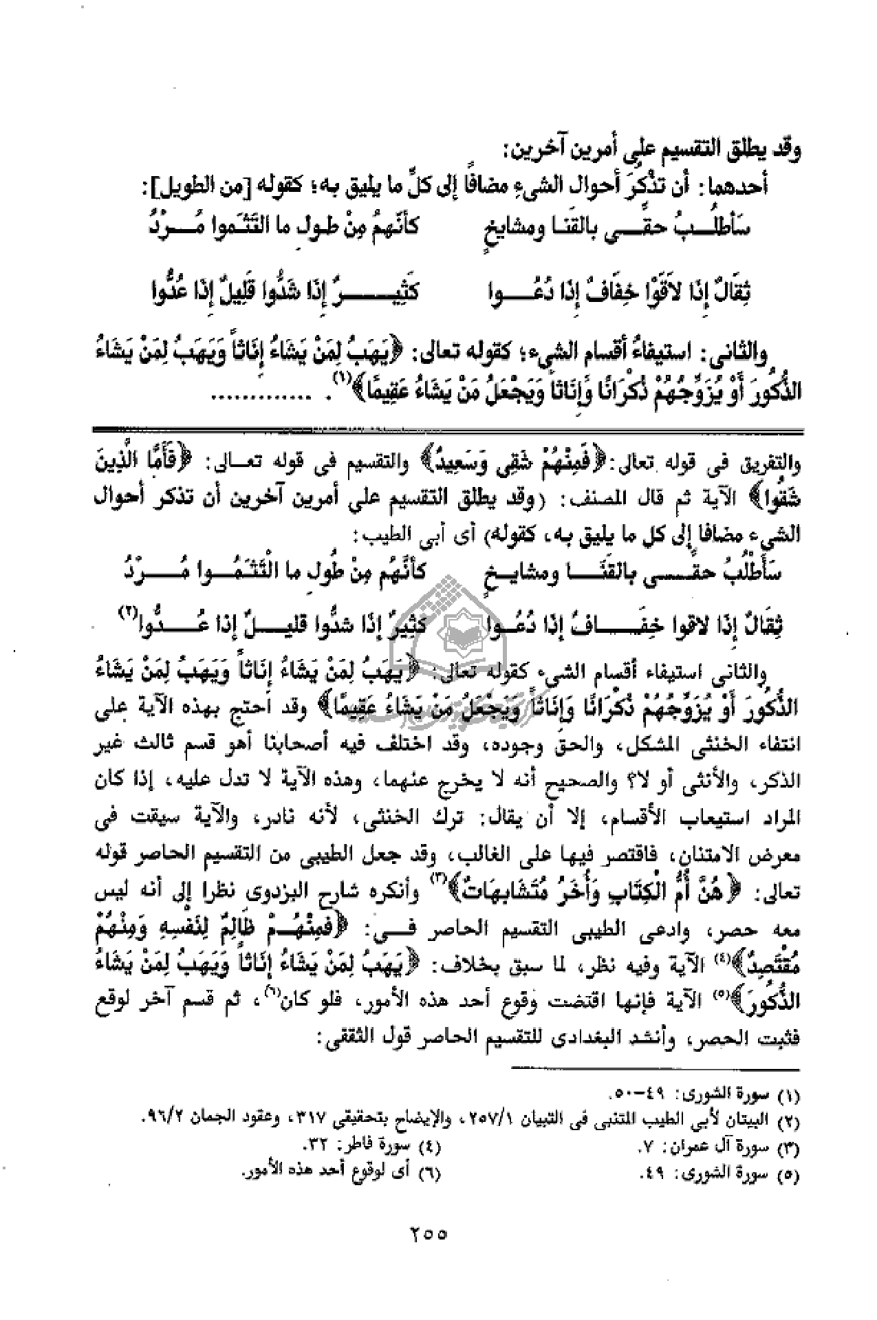 والثانى استيفاء أقسام الشئ كقوله تعالى: يَهَبُ لِمَنْ يَشاءُ إِناثاً وَيَهَبُ لِمَنْ يَشاءُ الذُّكُورَ أَوْ يُزَوِّجُهُمْ ذُكْراناً وَإِناثاً وَيَجْعَلُ مَنْ يَشاءُ عَقِيماً وقد احتج بهذه الآية على انتفاء الخنثى المشكل، والحق وجوده، وقد اختلف فيه أصحابنا أهو قسم ثالث غير الذكر، والأنثى أو لا؟ والصحيح أنه لا يخرج عنهما، وهذه الآية لا تدل عليه، إذا كان المراد استيعاب الأقسام، إلا أن يقال: ترك الخنثى، لأنه نادر، والآية سيقت فى معرض الامتنان، فاقتصر فيها على الغالب، وقد جعل الطيبى من التقسيم الحاصر قوله تعالى: هُنَّ أُمُّ الْكِتابِ وَأُخَرُ مُتَشابِهاتٌ (¬3) وأنكره شارح البزدوى نظرا إلى أنه ليس معه حصر، وادعى الطيبى التقسيم الحاصر فى: فَمِنْهُمْ ظالِمٌ لِنَفْسِهِ وَمِنْهُمْ مُقْتَصِدٌ (¬4) الآية وفيه نظر، لما سبق بخلاف: يَهَبُ لِمَنْ يَشاءُ إِناثاً وَيَهَبُ لِمَنْ يَشاءُ الذُّكُورَ (¬5) الآية فإنها اقتضت وقوع أحد هذه الأمور، فلو كان (¬6)، ثم قسم آخر لوقع فثبت الحصر، وأنشد البغدادى للتقسيم الحاصر قول الثقفى: