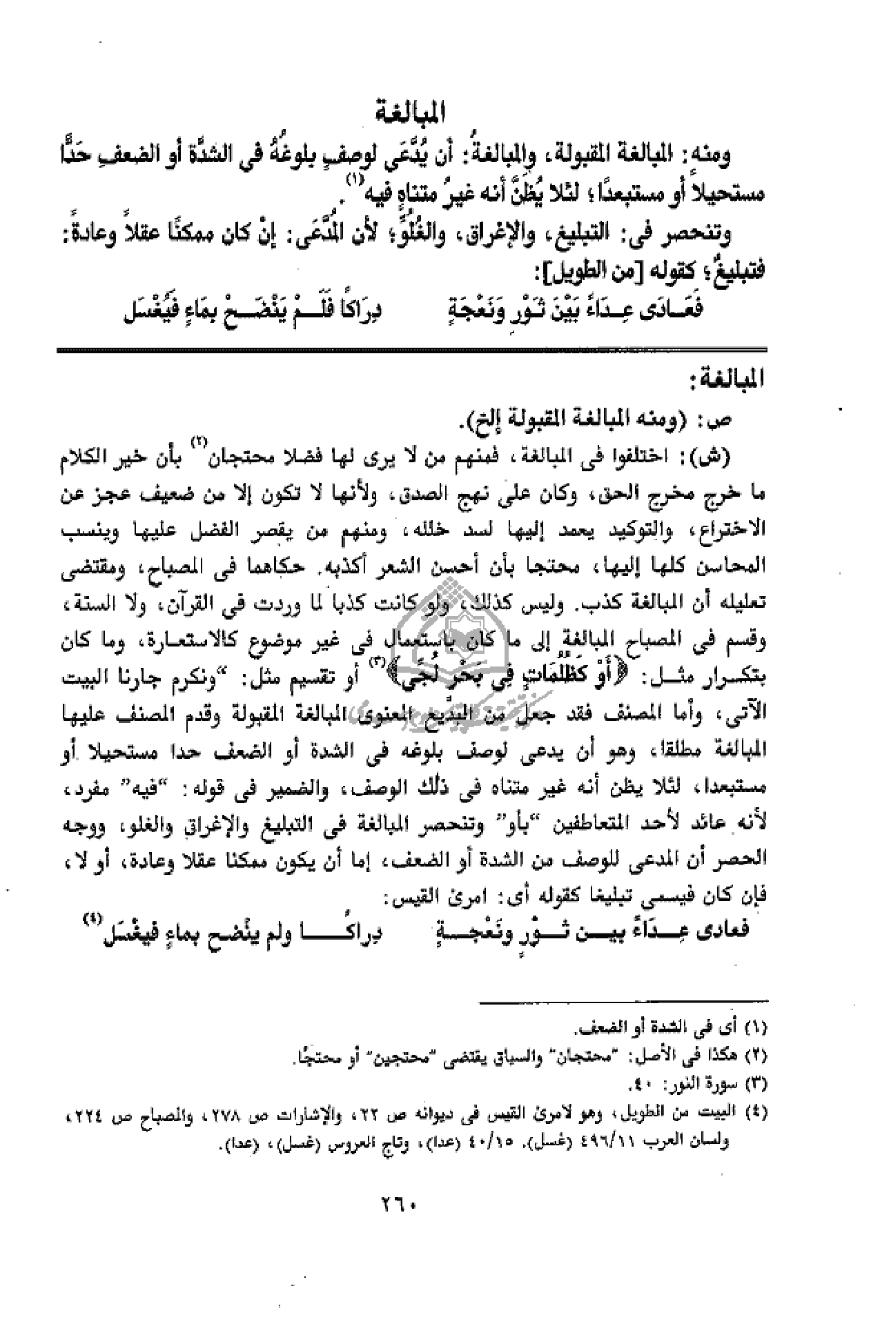 ومنه: المبالغة المقبولة، والمبالغة: أن يدّعى لوصف بلوغه فى الشدّة أو الضعف حدّا مستحيلا أو مستبعدا؛ لئلا يظنّ أنه غير متناه فيه (¬1).