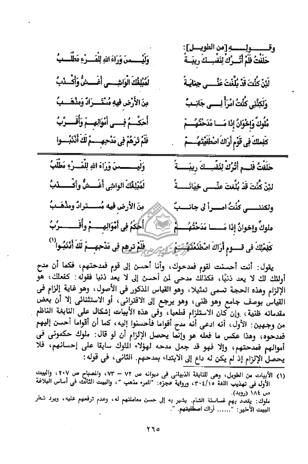 يقول: أنت أحسنت لقوم فمدحوك، وأنا أحسن إلى قوم فمدحتهم، فقوله: كفعلك، هو الإلزام وهذه الحجة تسمى تمثيلا، وهو القياس المذكور فى الأصول، وهو غاية إلزام فى القياس بوصف جامع وهو ظنى، وهو يرجع إلى الاقترانى، أو الاستثنائى إلا أن بعض مقدماته ظنية، وإن كان الاستلزام قطعيا، وفى هذه الأبيات إشكال على النابغة الناظم من وجهين: الأول، أنه ادعى أنه مدح أقواما فأحسنوا إليه، كما أن أقواما أحسن إليهم فمدحوه، وهذا عكس ما فعله هو وإنما يحصل الإلزام أن لو قال: ملوك حكمونى فى أموالهم فمدحتهم، وإلا فهو قد جعل مدحه لهؤلاء الملوك سابقا على إحسانهم، فلا يحصل الإلزام إذ لم يكن له داع إلى الابتداء بمدحهم. الثانى، فى قوله: