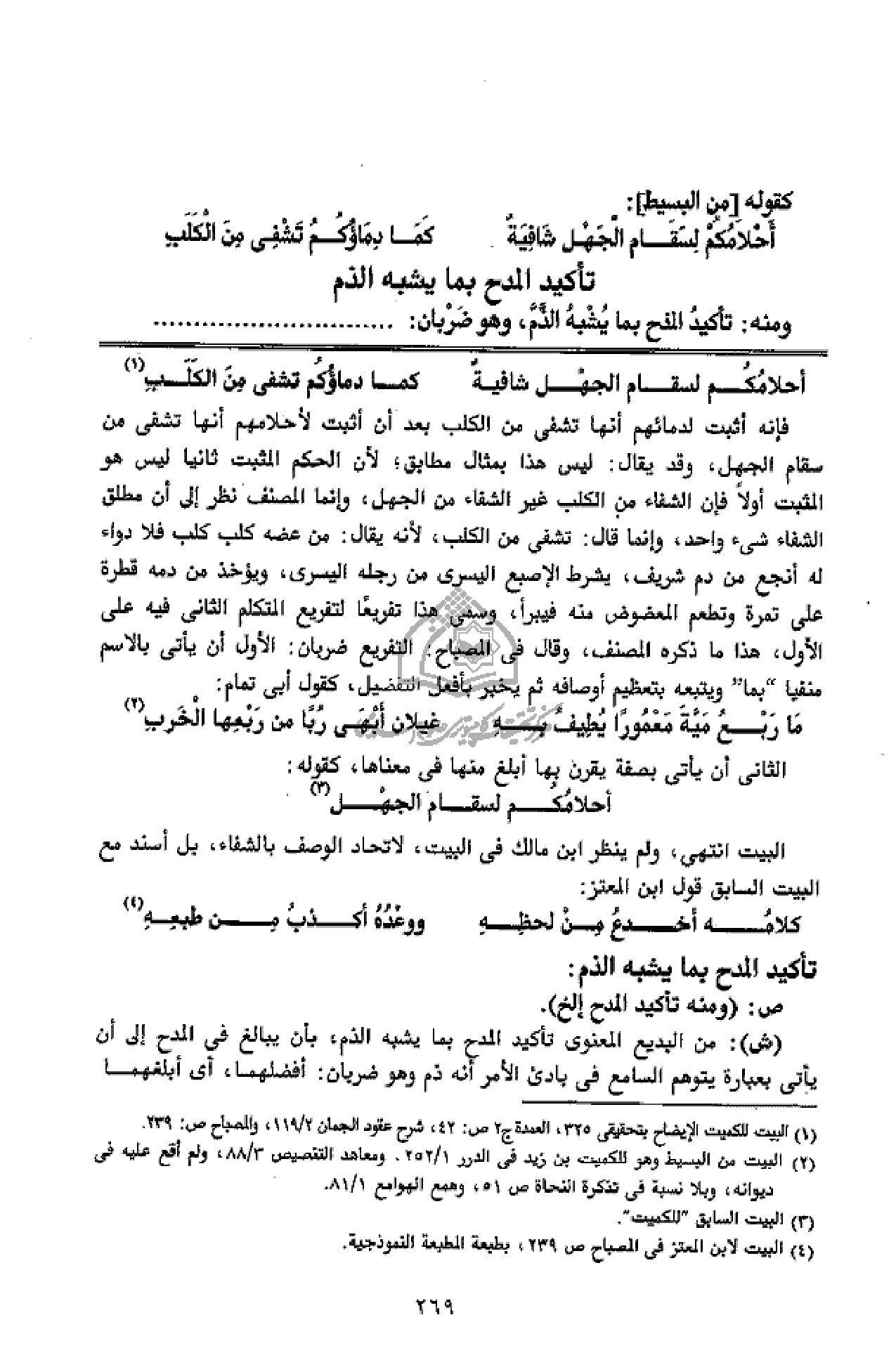 (ش): من البديع المعنوى تأكيد المدح بما يشبه الذم، بأن يبالغ فى المدح إلى أن يأتى بعبارة يتوهم السامع فى بادئ الأمر أنه ذم وهو ضربان: أفضلهما، أى أبلغهما