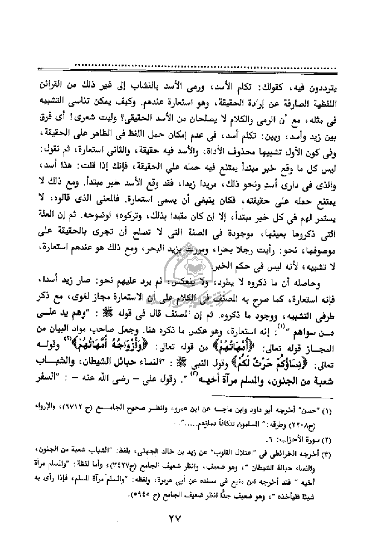 وحاصله أن ما ذكروه لا يطرد، ولا ينعكس، ثم يرد عليهم نحو: صار زيد أسدا، فإنه استعارة، كما صرح به المصنف فى الكلام على أن الاستعارة مجاز لغوى، مع ذكر طرفى التشبيه، ووجود ما ذكروه. ثم إن المصنف قال فى قوله صلّى الله عليه وسلّم:" وهم يد على من سواهم" (¬1): إنه استعارة، وهو عكس ما ذكره هنا. وجعل صاحب مواد البيان من المجاز قوله تعالى: أُمَّهاتُهُمْ من قوله تعالى: وَأَزْواجُهُ أُمَّهاتُهُمْ (¬2) وقوله تعالى: نِساؤُكُمْ حَرْثٌ لَكُمْ وقول النبى صلّى الله عليه وسلّم:" النساء حبائل الشيطان، والشباب شعبة من الجنون، والمسلم مرآة أخيه (¬3) ". وقول على - رضى الله عنه -:" السفر