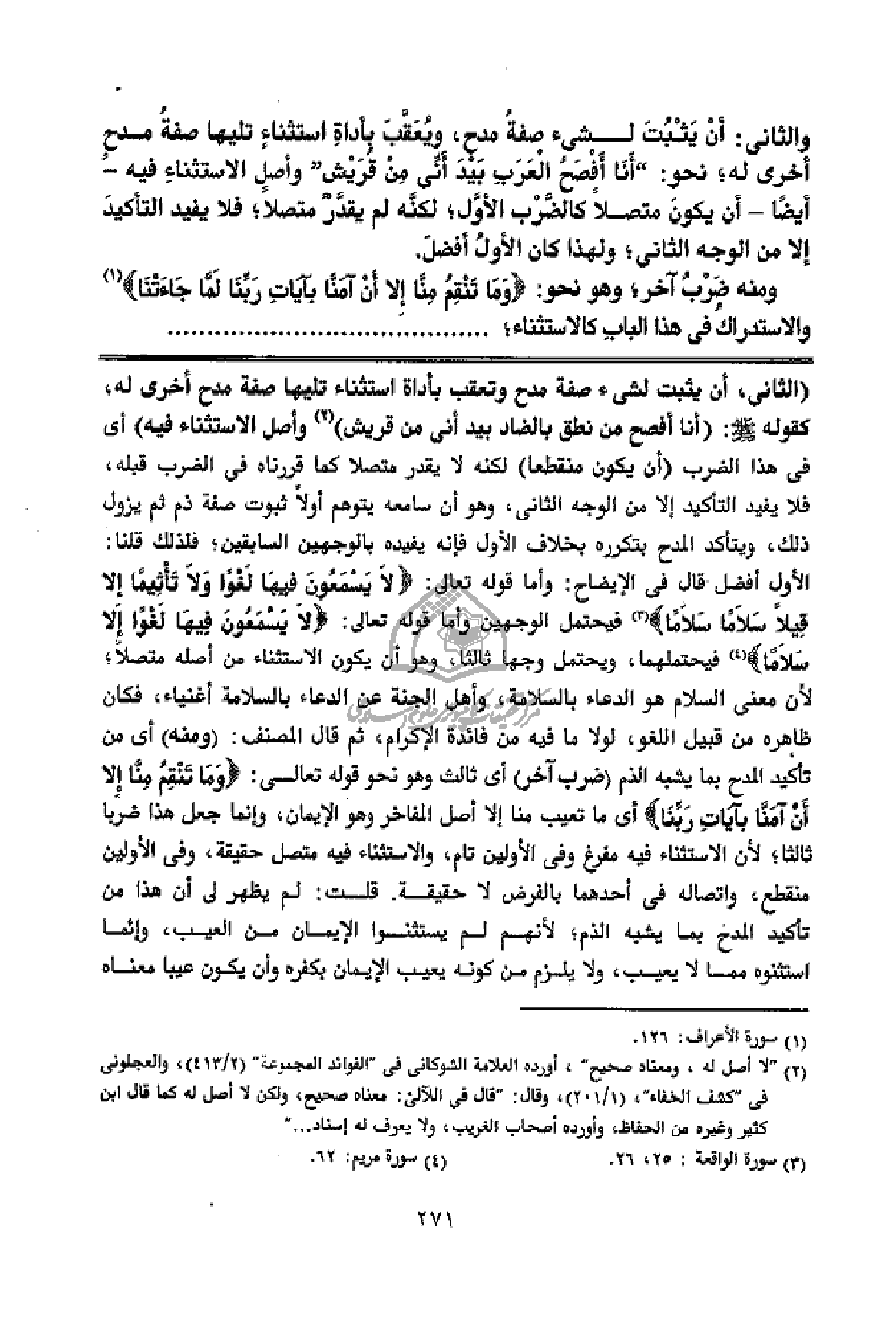 والثانى: أن يثبت لشئ صفة مدح، ويعقّب بأداة استثناء تليها صفة مدح أخرى له؛ نحو: أنا أفصح العرب بيد أنّى من قريش وأصل الاستثناء فيه - أيضا - أن يكون متصلا كالضّرب الأوّل؛ لكنّه لم يقدّر متصلا؛ فلا يفيد التأكيد إلا من الوجه الثانى؛ ولهذا كان الأول أفضل.