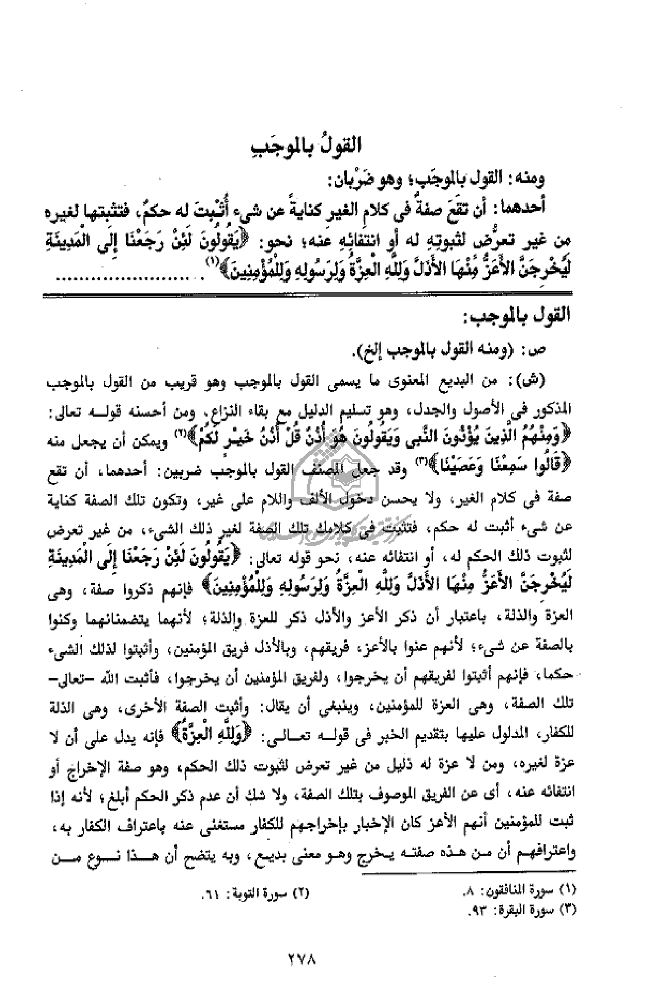 وَمِنْهُمُ الَّذِينَ يُؤْذُونَ النَّبِيَّ وَيَقُولُونَ هُوَ أُذُنٌ قُلْ أُذُنُ خَيْرٍ لَكُمْ (¬2) ويمكن أن يجعل منه قالُوا سَمِعْنا وَعَصَيْنا (¬3) وقد جعل المصنف القول بالموجب ضربين: أحدهما، أن تقع صفة فى كلام الغير، ولا يحسن دخول الألف واللام على غير، وتكون تلك الصفة كناية عن شئ أثبت له حكم، فتثبت فى كلامك تلك الصفة لغير ذلك الشئ، من غير تعرض لثبوت ذلك الحكم له، أو انتفائه عنه، نحو قوله تعالى: يَقُولُونَ لَئِنْ رَجَعْنا إِلَى الْمَدِينَةِ لَيُخْرِجَنَّ الْأَعَزُّ مِنْهَا الْأَذَلَّ وَلِلَّهِ الْعِزَّةُ وَلِرَسُولِهِ وَلِلْمُؤْمِنِينَ فإنهم ذكروا صفة، وهى العزة والذلة، باعتبار أن ذكر الأعز والأذل ذكر للعزة والذلة؛ لأنهما يتضمنانهما وكنوا بالصفة عن شئ؛ لأنهم عنوا بالأعز، فريقهم، وبالأذل فريق المؤمنين، وأثبتوا لذلك الشئ حكما، فإنهم أثبتوا لفريقهم أن يخرجوا، ولفريق المؤمنين أن يخرجوا، فأثبت الله - تعالى - تلك الصفة، وهى العزة للمؤمنين، وينبغى أن يقال: وأثبت الصفة الأخرى، وهى الذلة للكفار، المدلول عليها بتقديم الخبر فى قوله تعالى: وَلِلَّهِ الْعِزَّةُ فإنه يدل على أن لا عزة لغيره، ومن لا عزة له ذليل من غير تعرض لثبوت ذلك الحكم، وهو صفة الإخراج أو انتفائه عنه، أى عن الفريق الموصوف بتلك الصفة، ولا شك أن عدم ذكر الحكم أبلغ؛ لأنه إذا ثبت للمؤمنين أنهم الأعز كان الإخبار بإخراجهم للكفار مستغنى عنه باعتراف الكفار به، واعترافهم أن من هذه صفته يخرج وهو معنى بديع، وبه يتضح أن هذا نوع من