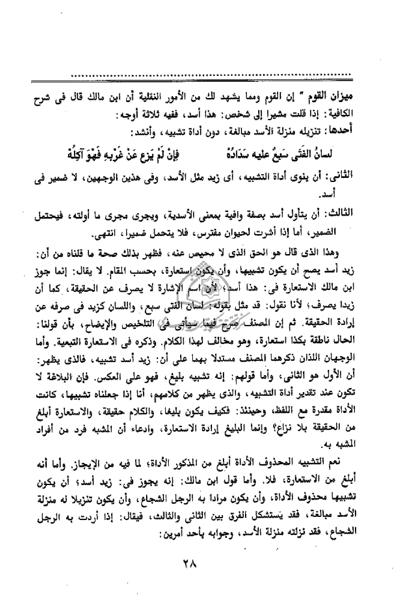 ميزان القوم" إن القوم ومما يشهد لك من الأمور النقلية أن ابن مالك قال فى شرح الكافية: إذا قلت مشيرا إلى شخص: هذا أسد، ففيه ثلاثة أوجه: