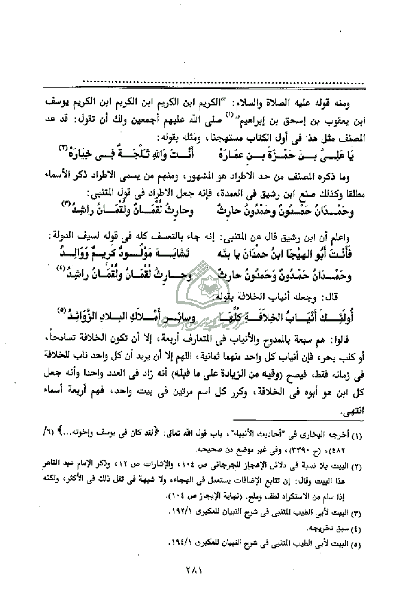 قالوا: هم سبعة بالممدوح والأنياب فى المتعارف أربعة، إلا أن تكون الخلافة تسامحا، أو كلب بحر، فإن أنياب كل واحد منهما ثمانية، اللهم إلا أن يريد أن كل واحد ناب للخلافة فى زمانه فقط، فيصح (وفيه من الزيادة على ما قبله) أنه زاد فى العدد واحدا وأنه جعل كل ابن هو أبوه فى الخلافة، وكرر كل اسم مرتين فى بيت واحد، فهم أربعة أسماء انتهى.