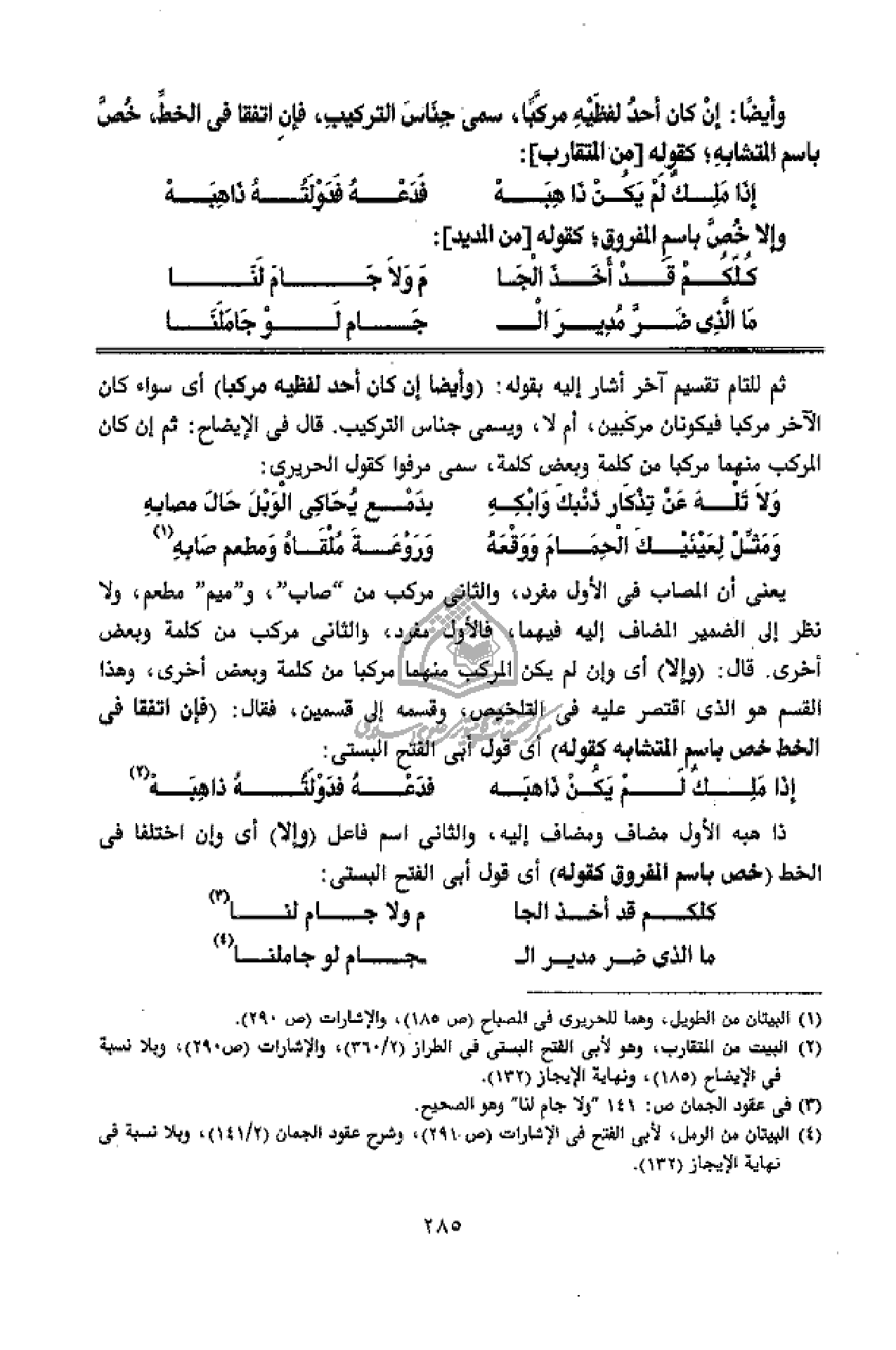 (¬4) البيتان من الرمل، لأبى الفتح فى الإشارات (ص 291)، وشرح عقود الجمان (2/ 141)، وبلا نسبة فى نهاية الإيجاز (132).