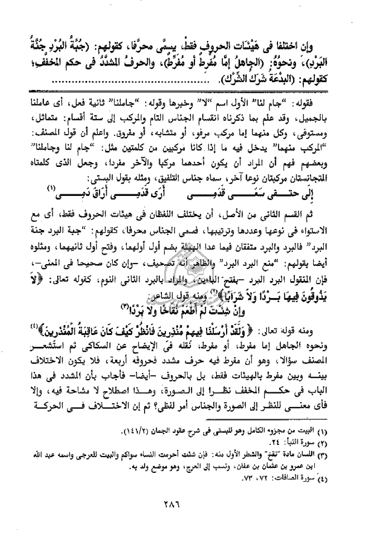 ثم القسم الثانى من الأصل، أن يختلف اللفظان فى هيئات الحروف فقط، أى مع الاستواء فى نوعها وعددها وترتيبها، فسمى الجناس محرفا، كقولهم: جبة البرد جنة البرد فالبرد والبرد متفقان فيما عدا الهيئة بضم أول أولهما، وفتح أول ثانيهما، ومثلوه أيضا بقولهم: منع البرد البرد والظاهر أنه تصحيف، - وإن كان صحيحا فى المعنى -، فإن المنقول البرد البرد - بفتح الباءين، والمراد بالبرد الثانى النوم، كقوله تعالى: لا يَذُوقُونَ فِيها بَرْداً وَلا شَراباً (¬2) ومنه قول الشاعر: