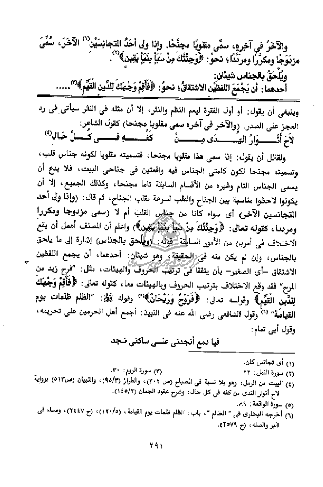 ولقائل أن يقول: إذا سمى هذا مقلوبا مجنحا، فتسميته مقلوبا لكونه جناس قلب، وتسميته مجنحا لكون كلمتى الجناس فيه واقعتين فى جناحى البيت، فلا بدع أن يسمى الجناس التام وغيره من الأقسام السابقة تاما مجنحا، وكذلك الجميع، إلا أن يكونوا لاحظوا مناسبة بين الجناح والقلب لسرعة تقلب الجناح، ثم قال: (وإذا ولى أحد المتجانسين الآخر) أى سواء كانا من جناس القلب أم لا (سمى مزدوجا ومكررا ومرددا، كقوله تعالى: وَجِئْتُكَ مِنْ سَبَإٍ بِنَبَإٍ يَقِينٍ) واعلم أن المصنف أهمل أن يقع الاختلاف فى أمرين من الأمور السابقة. قوله: (ويلحق بالجناس) إشارة إلى ما يلحق بالجناس، وإن لم يكن منه فى الحقيقة، وهو شيئان: أحدهما، أن يجمع اللفظين الاشتقاق - أى الصغير - بأن يتفقا فى ترتيب الحروف والهيئات، مثل:" فرح زيد من المرح" فقد وقع الاختلاف بترتيب الحروف وبالهيئات معا، كقوله تعالى: فَأَقِمْ وَجْهَكَ لِلدِّينِ الْقَيِّمِ وقوله تعالى: فَرَوْحٌ وَرَيْحانٌ (¬5) وقوله صلّى الله عليه وسلّم:" الظلم ظلمات يوم القيامة" (¬6) وقول الشافعى رضى الله عنه فى النبيذ: أجمع أهل الحرمين على تحريمه، وقول أبى تمام: