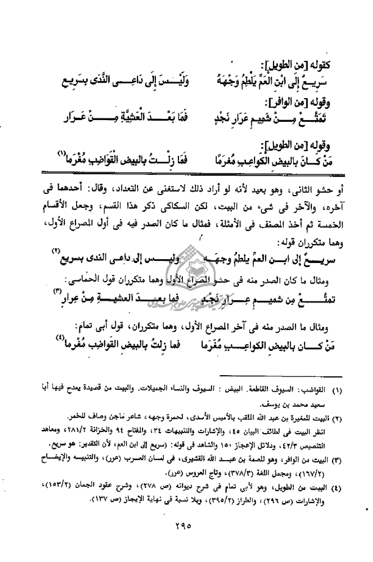 ومثال ما الصدر منه فى آخر المصراع الأول، وهما متكرران، قول أبى تمام: