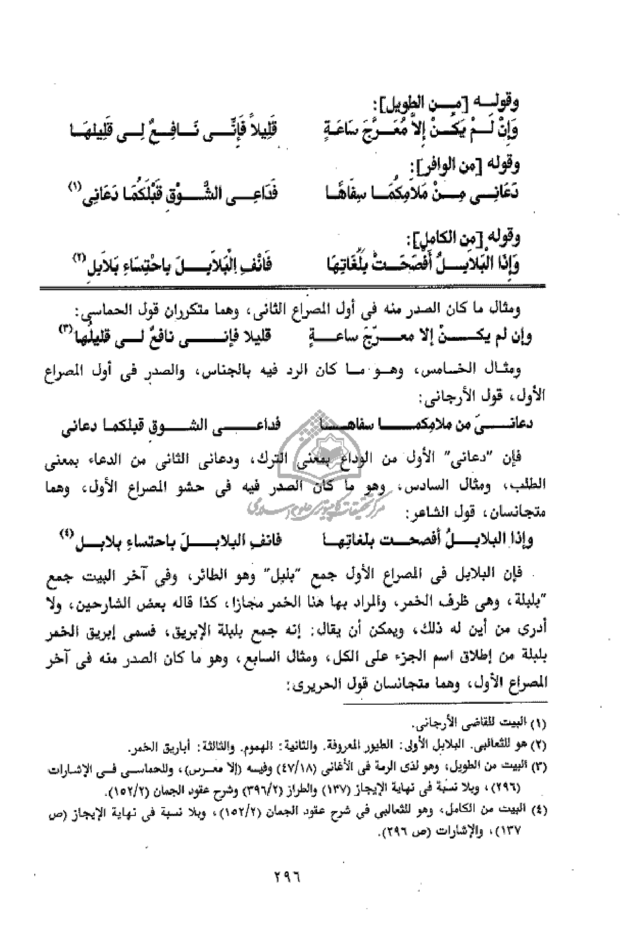 (¬4) البيت من الكامل، وهو للثعالبى فى شرح عقود الجمان (2/ 152)، وبلا نسبة فى نهاية الإيجاز (ص 137)، والإشارات (ص 296).