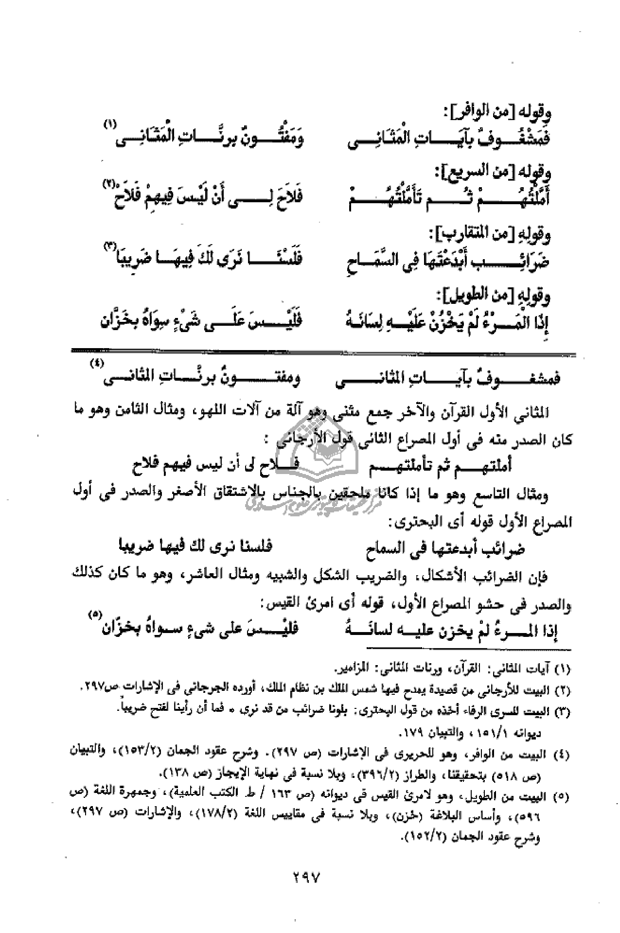 المثانى الأول القرآن والآخر جمع مثنى وهو آلة من آلات اللهو، ومثال الثامن وهو ما كان الصدر منه فى أول المصراع الثانى قول الأرجانى: