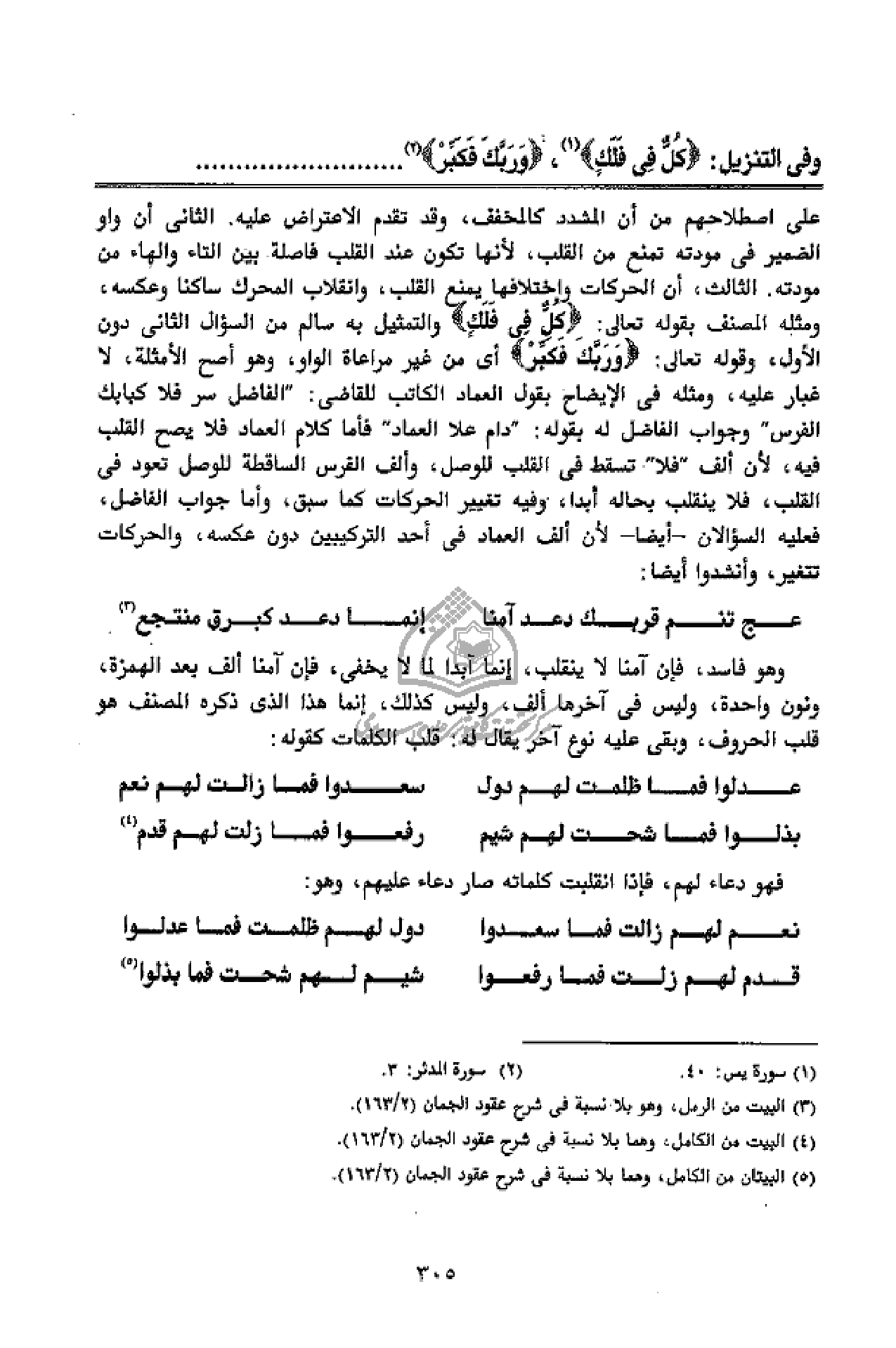 على اصطلاحهم من أن المشدد كالمخفف، وقد تقدم الاعتراض عليه. الثانى أن واو الضمير فى مودته تمنع من القلب، لأنها تكون عند القلب فاصلة بين التاء والهاء من مودته. الثالث، أن الحركات واختلافها يمنع القلب، وانقلاب المحرك ساكنا وعكسه، ومثله المصنف بقوله تعالى: كُلٌّ فِي فَلَكٍ والتمثيل به سالم من السؤال الثانى دون الأول، وقوله تعالى: وَرَبَّكَ فَكَبِّرْ أى من غير مراعاة الواو، وهو أصح الأمثلة، لا غبار عليه، ومثله فى الإيضاح بقول العماد الكاتب للقاضى:" الفاضل سر فلا كبابك الفرس" وجواب الفاضل له بقوله:" دام علا العماد" فأما كلام العماد فلا يصح القلب فيه، لأن ألف" فلا" تسقط فى القلب للوصل، وألف الفرس الساقطة للوصل تعود فى القلب، فلا ينقلب بحاله أبدا، وفيه تغيير الحركات كما سبق، وأما جواب الفاضل، فعليه السؤالان - أيضا - لأن ألف العماد فى أحد التركيبين دون عكسه، والحركات تتغير، وأنشدوا أيضا: