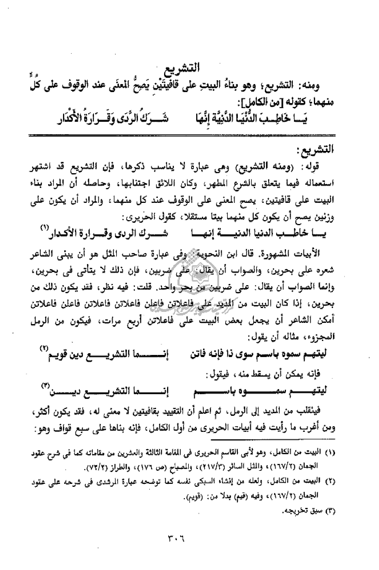 التشريع: قوله: (ومنه التشريع) وهى عبارة لا يناسب ذكرها، فإن التشريع قد اشتهر استعماله فيما يتعلق بالشرع المطهر، وكان اللائق اجتنابها، وحاصله أن المراد بناء البيت على قافيتين، يصح المعنى على الوقوف عند كل منهما، والمراد أن يكون على وزنين يصح أن يكون كل منهما بيتا مستقلا، كقول الحريرى: