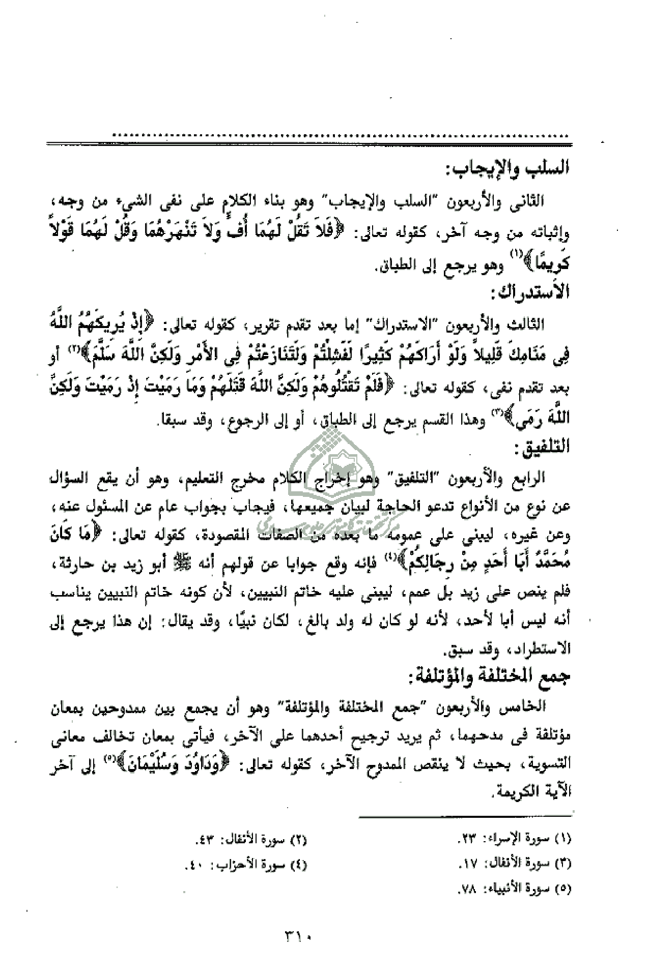 السلب والإيجاب: الثانى والأربعون" السلب والإيجاب" وهو بناء الكلام على نفى الشئ من وجه، وإثباته من وجه آخر، كقوله تعالى: فَلا تَقُلْ لَهُما أُفٍّ وَلا تَنْهَرْهُما وَقُلْ لَهُما قَوْلًا كَرِيماً (¬1) وهو يرجع إلى الطباق.