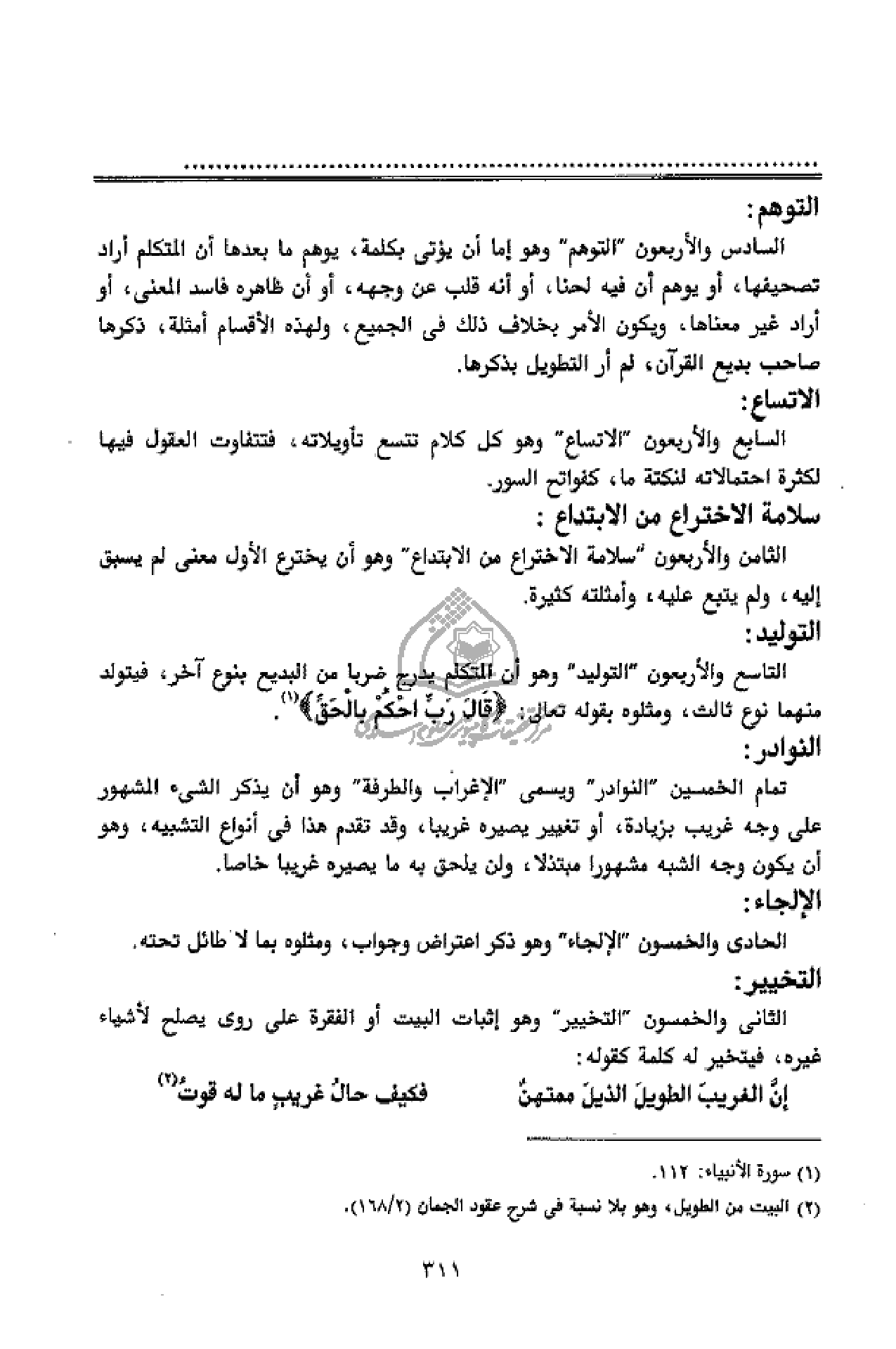 التوهم: السادس والأربعون" التوهم" وهو إما أن يؤتى بكلمة، يوهم ما بعدها أن المتكلم أراد تصحيفها، أو يوهم أن فيه لحنا، أو أنه قلب عن وجهه، أو أن ظاهره فاسد المعنى، أو أراد غير معناها، ويكون الأمر بخلاف ذلك فى الجميع، ولهذه الأقسام أمثلة، ذكرها صاحب بديع القرآن، لم أر التطويل بذكرها.