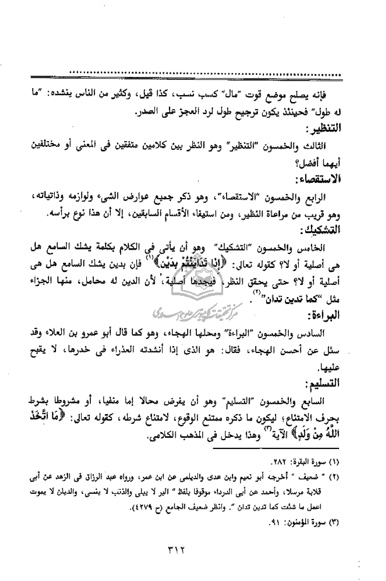 التسليم: السابع والخمسون" التسليم" وهو أن يفرض محالا إما منفيا، أو مشروطا بشرط بحرف الامتناع؛ ليكون ما ذكره ممتنع الوقوع، لامتناع شرطه، كقوله تعالى: مَا اتَّخَذَ اللَّهُ مِنْ وَلَدٍ الآية (¬3) وهذا يدخل فى المذهب الكلامى.