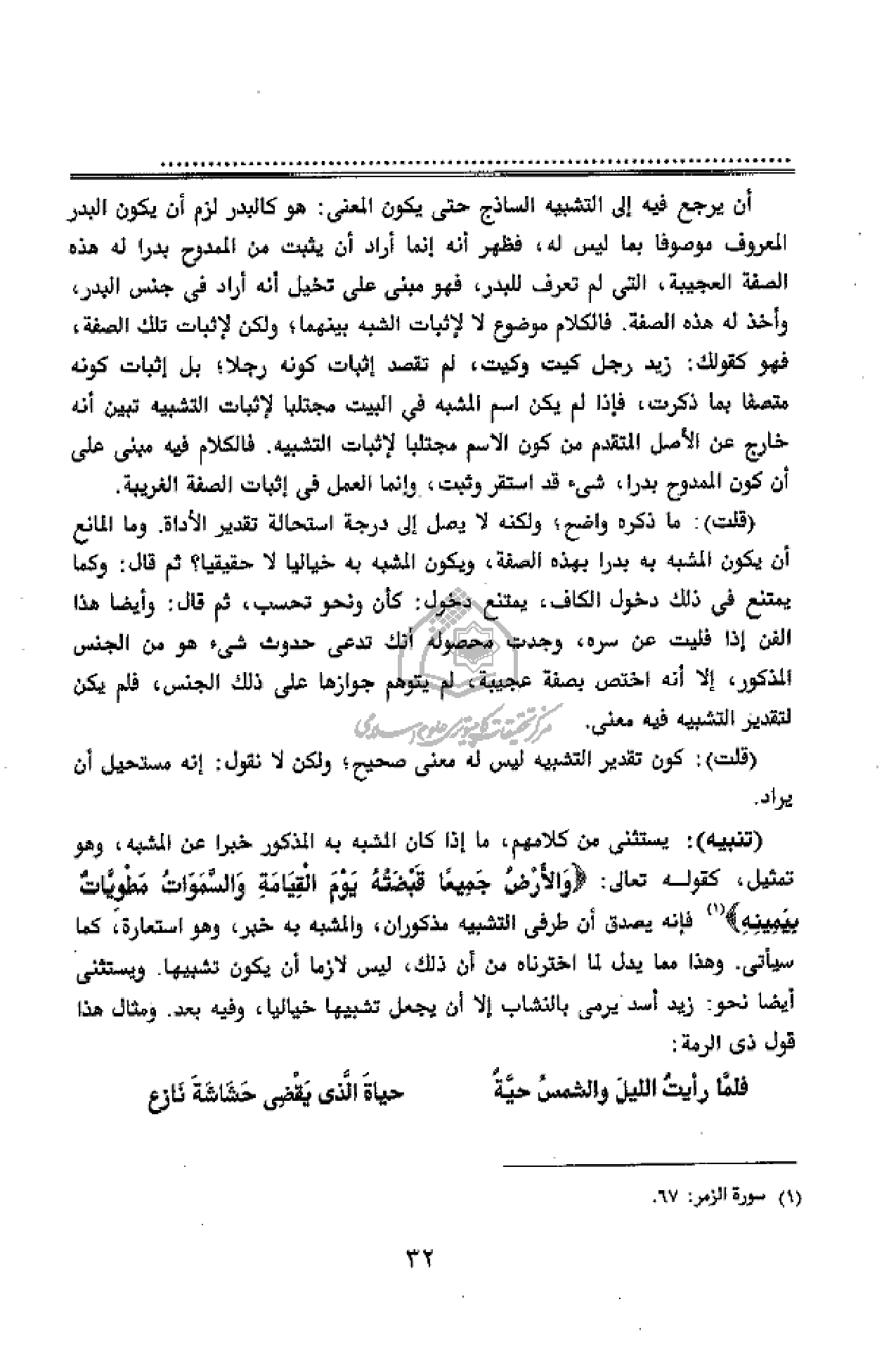 (تنبيه): يستثنى من كلامهم، ما إذا كان المشبه به المذكور خبرا عن المشبه، وهو تمثيل، كقوله تعالى: وَالْأَرْضُ جَمِيعاً قَبْضَتُهُ يَوْمَ الْقِيامَةِ وَالسَّماواتُ مَطْوِيَّاتٌ بِيَمِينِهِ (¬1) فإنه يصدق أن طرفى التشبيه مذكوران، والمشبه به خبر، وهو استعارة، كما سيأتى. وهذا مما يدل لما اخترناه من أن ذلك، ليس لازما أن يكون تشبيها. ويستثنى أيضا نحو: زيد أسد يرمى بالنشاب إلا أن يجعل تشبيها خياليا، وفيه بعد. ومثال هذا قول ذى الرمة: