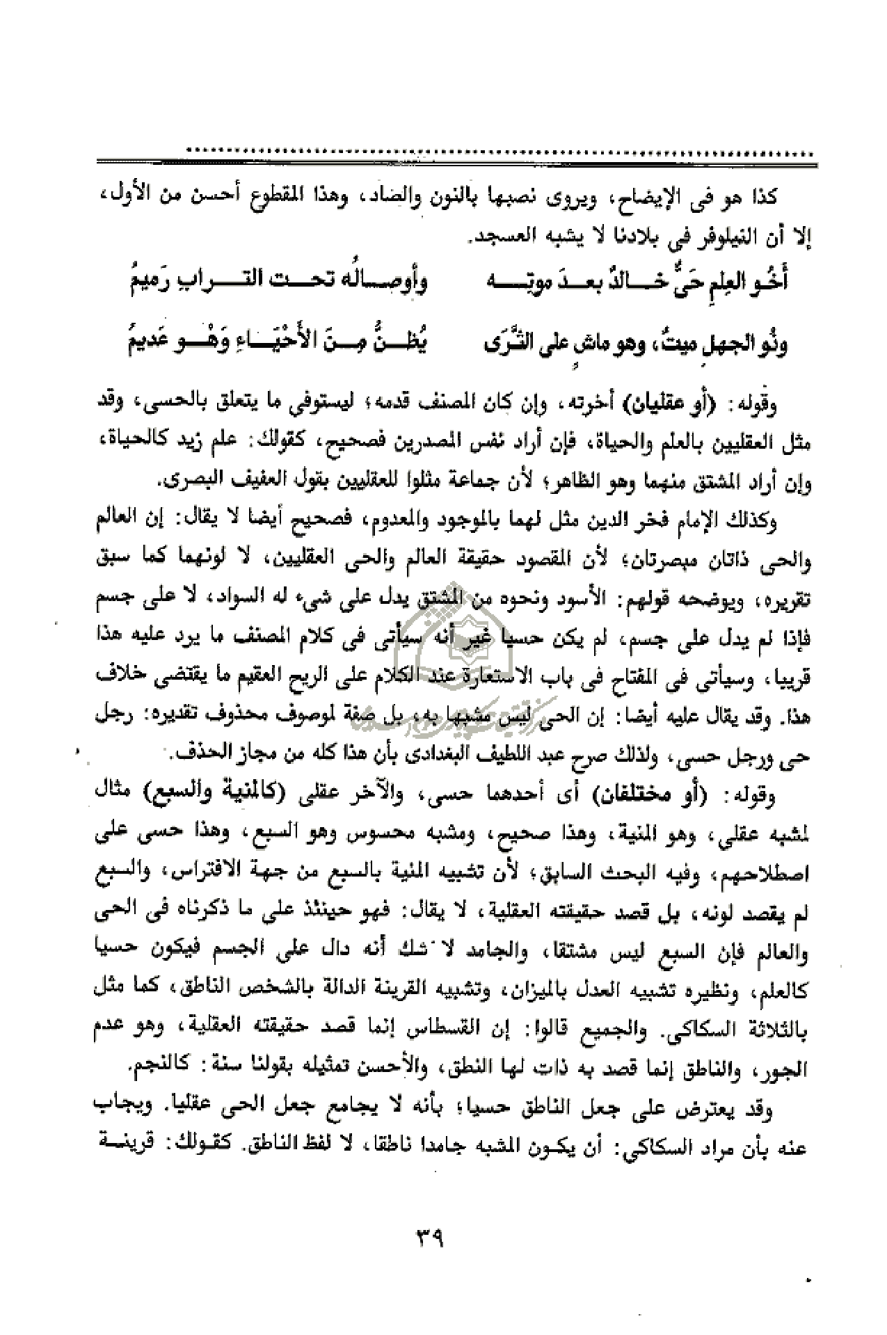 وكذلك الإمام فخر الدين مثل لهما بالموجود والمعدوم، فصحيح أيضا لا يقال: إن العالم والحى ذاتان مبصرتان؛ لأن المقصود حقيقة العالم والحى العقليين، لا لونهما كما سبق تقريره، ويوضحه قولهم: الأسود ونحوه من المشتق يدل على شئ له السواد، لا على جسم فإذا لم يدل على جسم، لم يكن حسيا غير أنه سيأتى فى كلام المصنف ما يرد عليه هذا قريبا، وسيأتى فى المفتاح فى باب الاستعارة عند الكلام على الريح العقيم ما يقتضى خلاف هذا. وقد يقال عليه أيضا: إن الحى ليس مشبها به، بل صفة لموصوف محذوف تقديره: رجل حى ورجل حسى، ولذلك صرح عبد اللطيف البغدادى بأن هذا كله من مجاز الحذف.