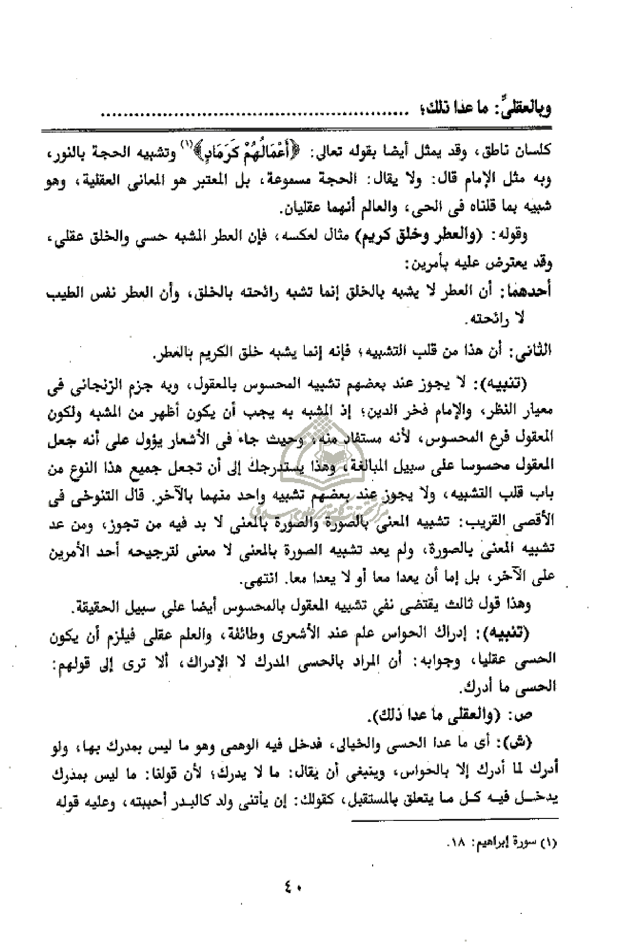 (تنبيه): لا يجوز عند بعضهم تشبيه المحسوس بالمعقول، وبه جزم الزنجانى فى معيار النظر، والإمام فخر الدين؛ إذ المشبه به يجب أن يكون أظهر من المشبه ولكون المعقول فرع المحسوس، لأنه مستفاد منه، وحيث جاء فى الأشعار يؤول على أنه جعل المعقول محسوسا على سبيل المبالغة، وهذا يستدرجك إلى أن تجعل جميع هذا النوع من باب قلب التشبيه، ولا يجوز عند بعضهم تشبيه واحد منهما بالآخر. قال التنوخى فى الأقصى القريب: تشبيه المعنى بالصورة والصورة بالمعنى لا بد فيه من تجوز، ومن عد تشبيه المعنى بالصورة، ولم يعد تشبيه الصورة بالمعنى لا معنى لترجيحه أحد الأمرين على الآخر، بل إما أن يعدا معا أو لا يعدا معا. انتهى.