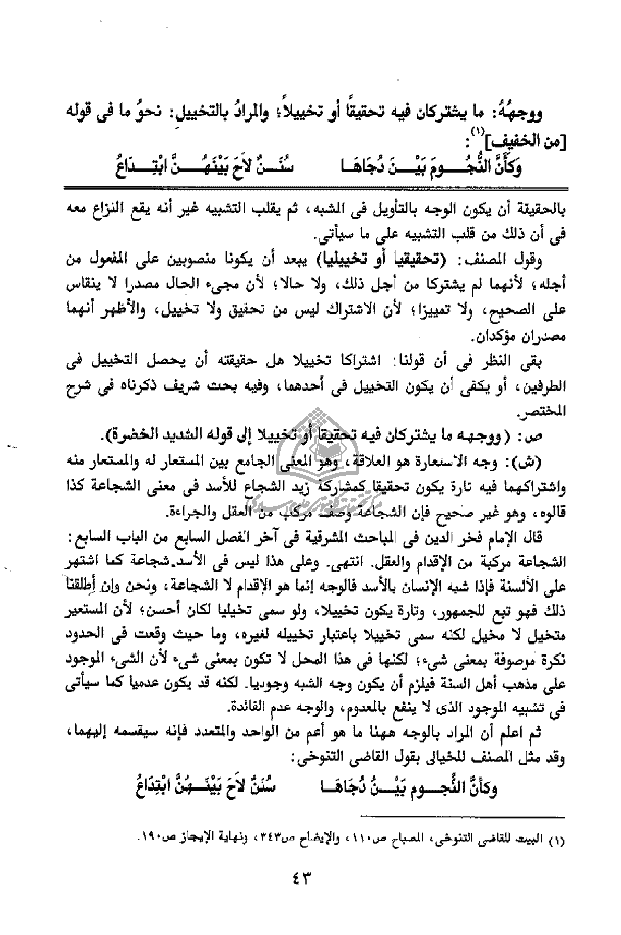 (ش): وجه الاستعارة هو العلاقة، وهو المعنى الجامع بين المستعار له والمستعار منه واشتراكهما فيه تارة يكون تحقيقا كمشاركة زيد الشجاع للأسد فى معنى الشجاعة كذا قالوه، وهو غير صحيح فإن الشجاعة وصف مركب من العقل والجراءة.
