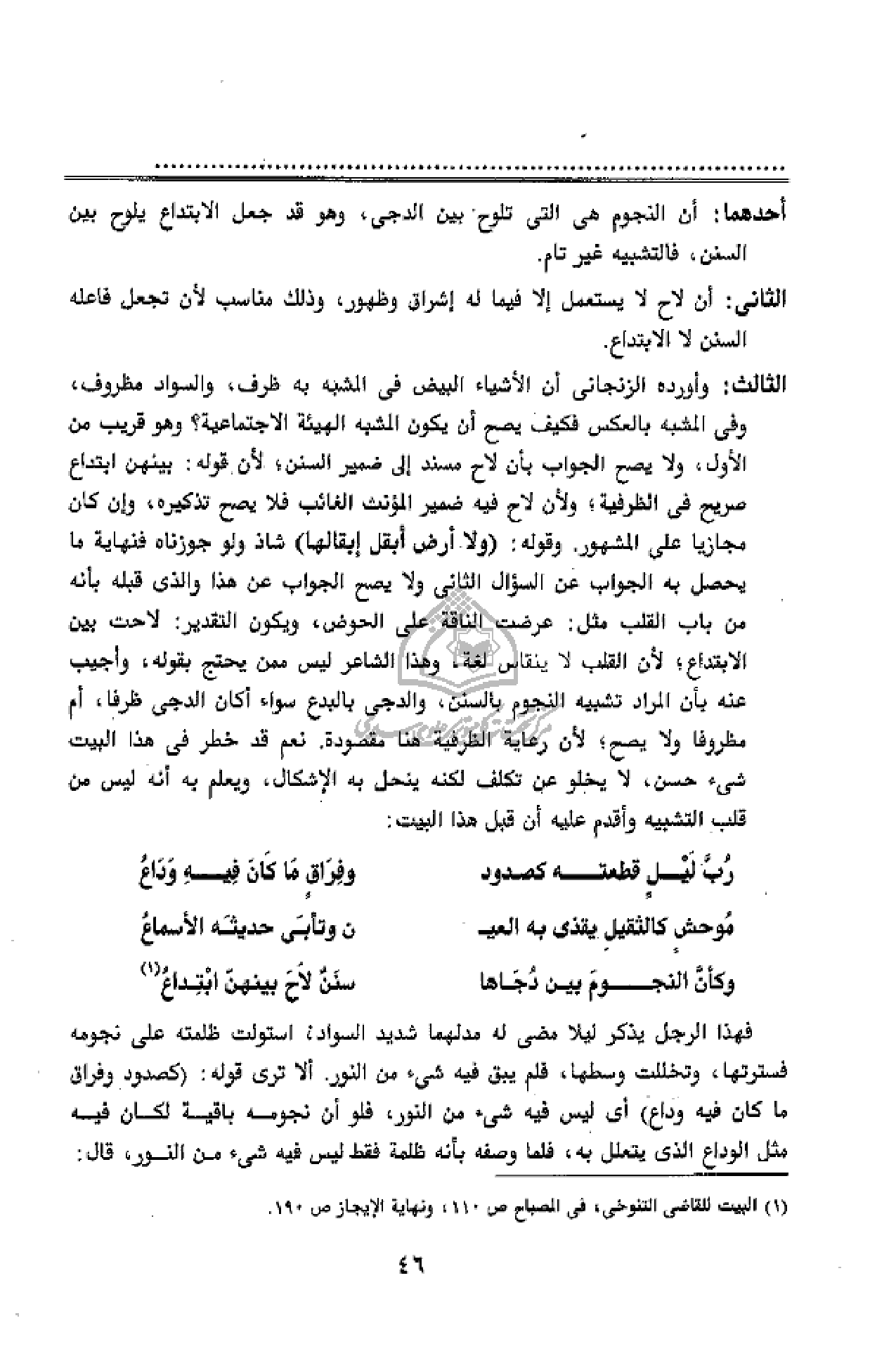 (¬1) البيت للقاضى التنوخى، فى المصباح ص 110، ونهاية الإيجاز ص 190.