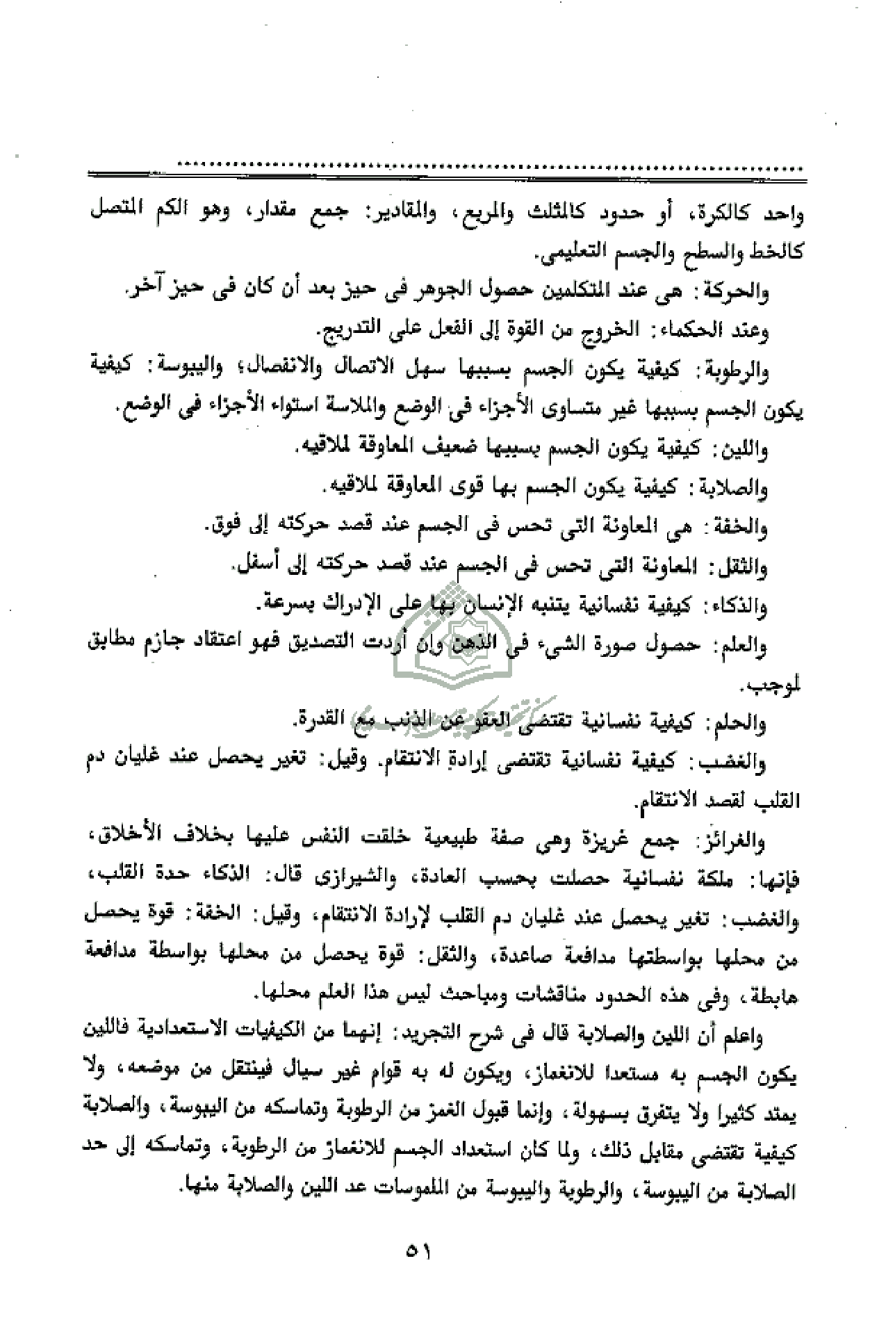 والرطوبة: كيفية يكون الجسم بسببها سهل الاتصال والانفصال؛ واليبوسة: كيفية يكون الجسم بسببها غير متساوى الأجزاء فى الوضع والملاسة استواء الأجزاء فى الوضع.