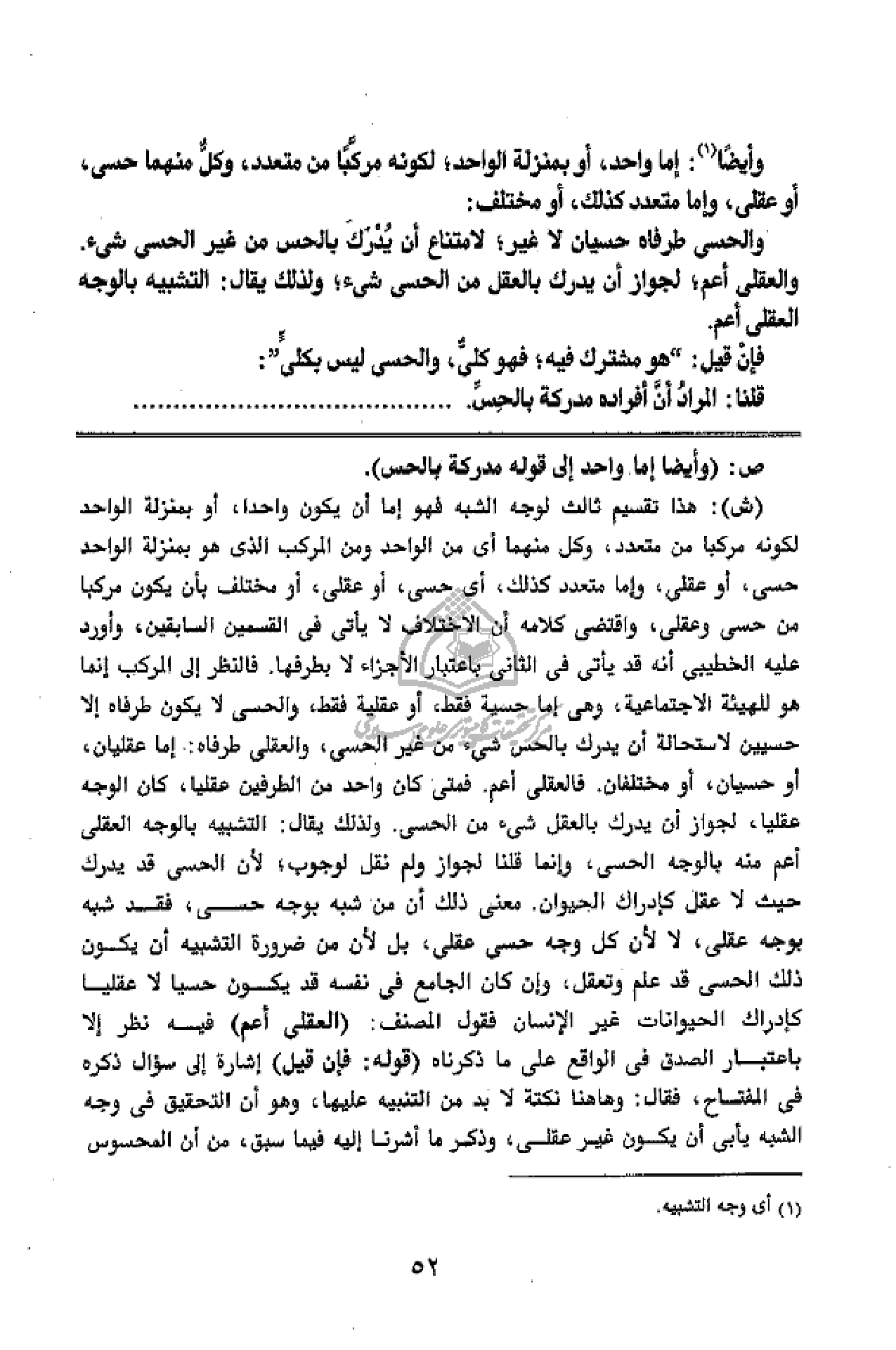 (ش): هذا تقسيم ثالث لوجه الشبه فهو إما أن يكون واحدا، أو بمنزلة الواحد لكونه مركبا من متعدد، وكل منهما أى من الواحد ومن المركب الذى هو بمنزلة الواحد حسى، أو عقلى، وإما متعدد كذلك، أى حسى، أو عقلى، أو مختلف