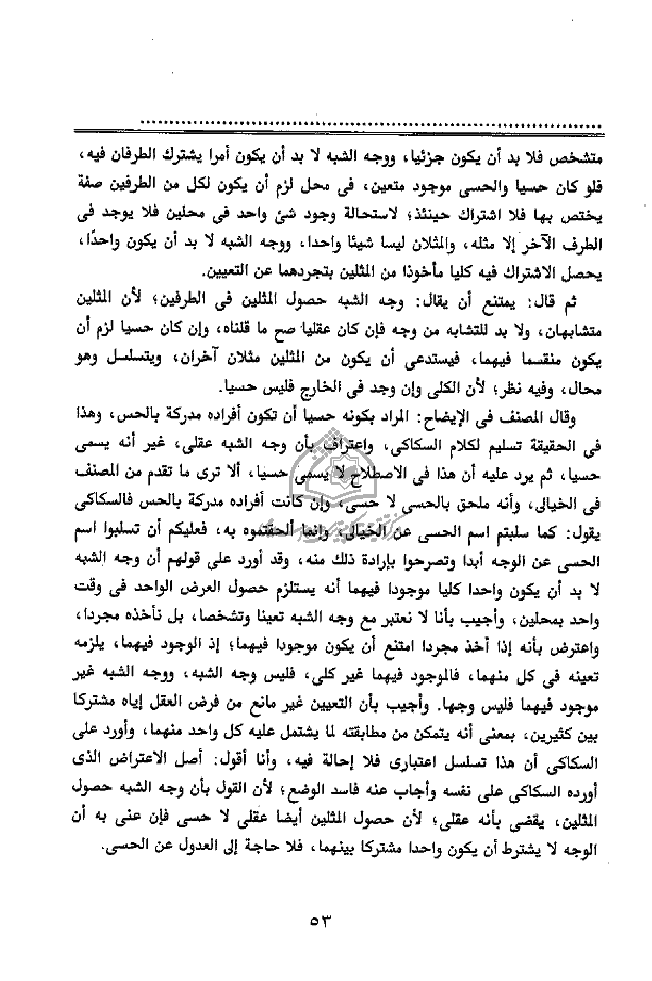 ثم قال: يمتنع أن يقال: وجه الشبه حصول المثلين فى الطرفين؛ لأن المثلين متشابهان، ولا بد للتشابه من وجه فإن كان عقليا صح ما قلناه، وإن كان حسيا لزم أن يكون منقسما فيهما، فيستدعى أن يكون من المثلين مثلان آخران، ويتسلسل وهو محال، وفيه نظر؛ لأن الكلى وإن وجد فى الخارج فليس حسيا.