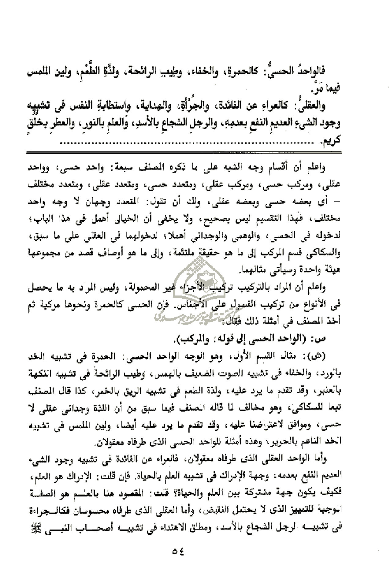 وأما الواحد العقلى الذى طرفاه معقولان، فالعراء عن الفائدة فى تشبيه وجود الشئ العديم النفع بعدمه، وجهة الإدراك فى تشبيه العلم بالحياة. فإن قلت: الإدراك هو العلم، فكيف يكون جهة مشتركة بين العلم والحياة؟ قلت: المقصود هنا بالعلم هو الصفة الموجبة للتمييز الذى لا يحتمل النقيض، وأما العقلى الذى طرفاه محسوسان فكالجراءة فى تشبيه الرجل الشجاع بالأسد، ومطلق الاهتداء فى تشبيه أصحاب النبى صلّى الله عليه وسلّم