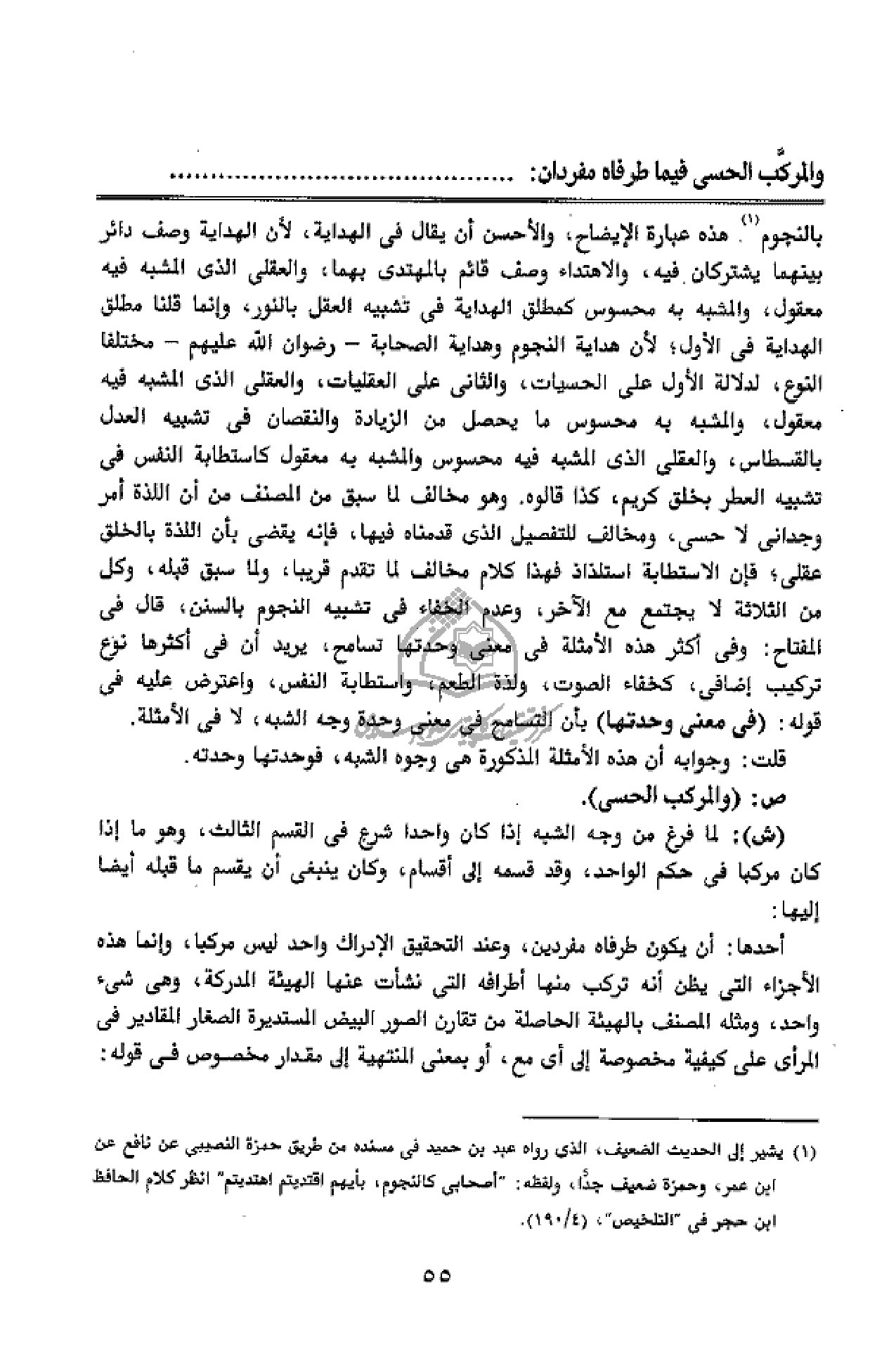 أحدها: أن يكون طرفاه مفردين، وعند التحقيق الإدراك واحد ليس مركبا، وإنما هذه الأجزاء التى يظن أنه تركب منها أطرافه التى نشأت عنها الهيئة المدركة، وهى شئ واحد، ومثله المصنف بالهيئة الحاصلة من تقارن الصور