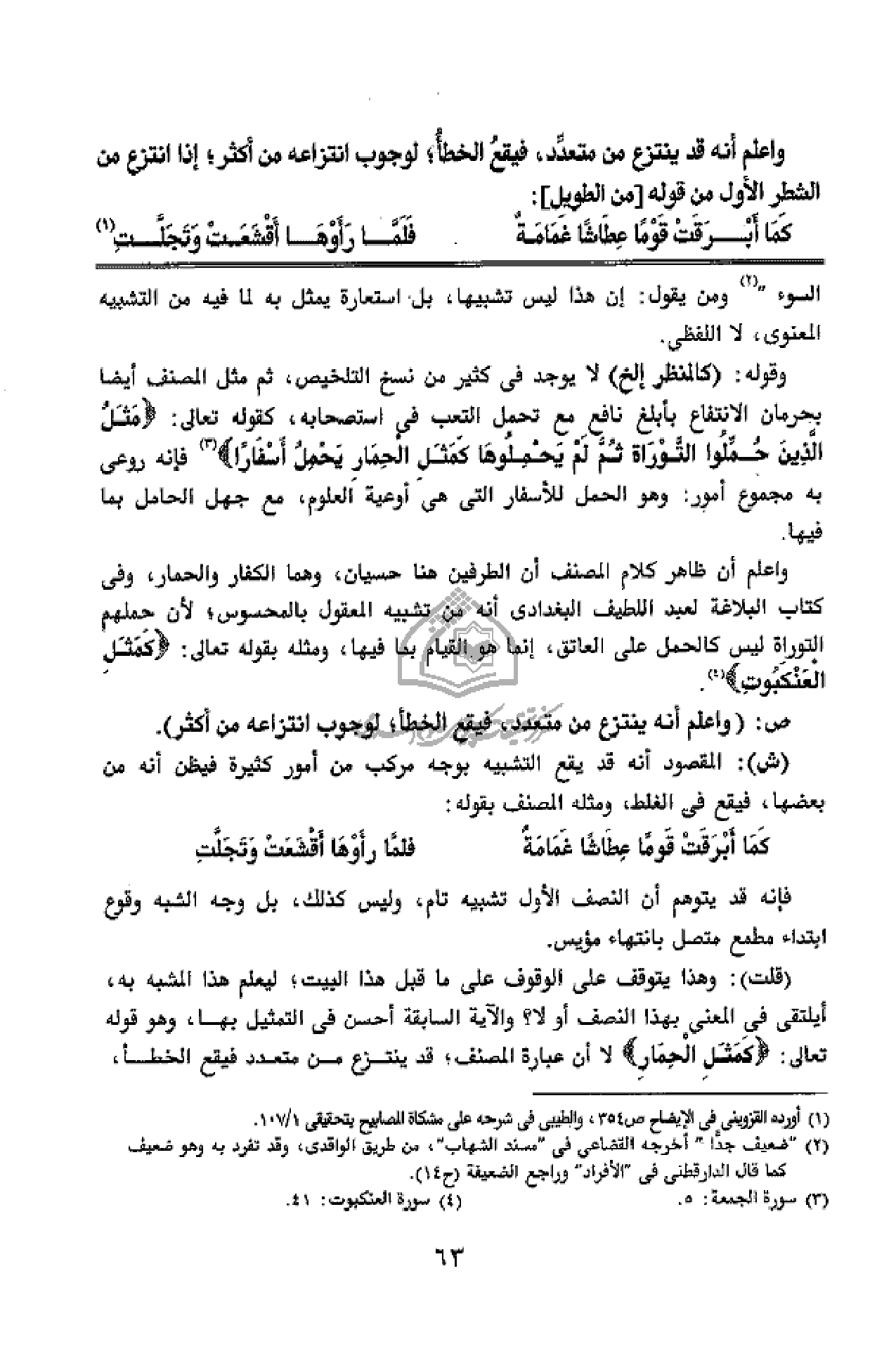واعلم أن ظاهر كلام المصنف أن الطرفين هنا حسيان، وهما الكفار والحمار، وفى كتاب البلاغة لعبد اللطيف البغدادى أنه من تشبيه المعقول بالمحسوس؛ لأن حملهم التوراة ليس كالحمل على العاتق، إنما هو القيام بما فيها، ومثله بقوله تعالى: كَمَثَلِ الْعَنْكَبُوتِ (¬4).