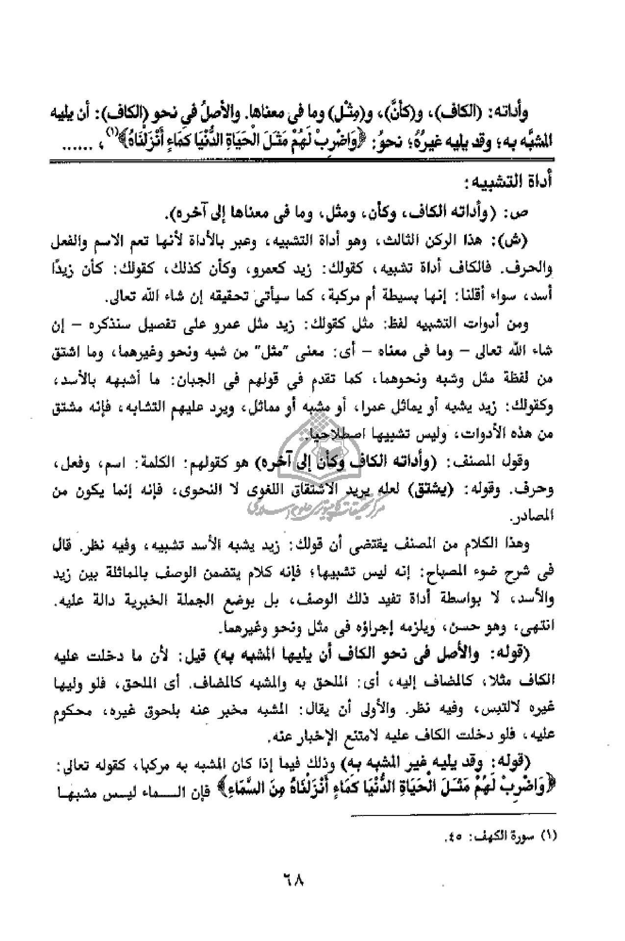 وأداته: (الكاف)، و (كأنّ)، و (مثل) وما فى معناها. والأصل فى نحو (الكاف): أن يليه المشبّه به؛ وقد يليه غيره؛ نحو: وَاضْرِبْ لَهُمْ مَثَلَ الْحَياةِ الدُّنْيا كَماءٍ أَنْزَلْناهُ (¬1)، ...