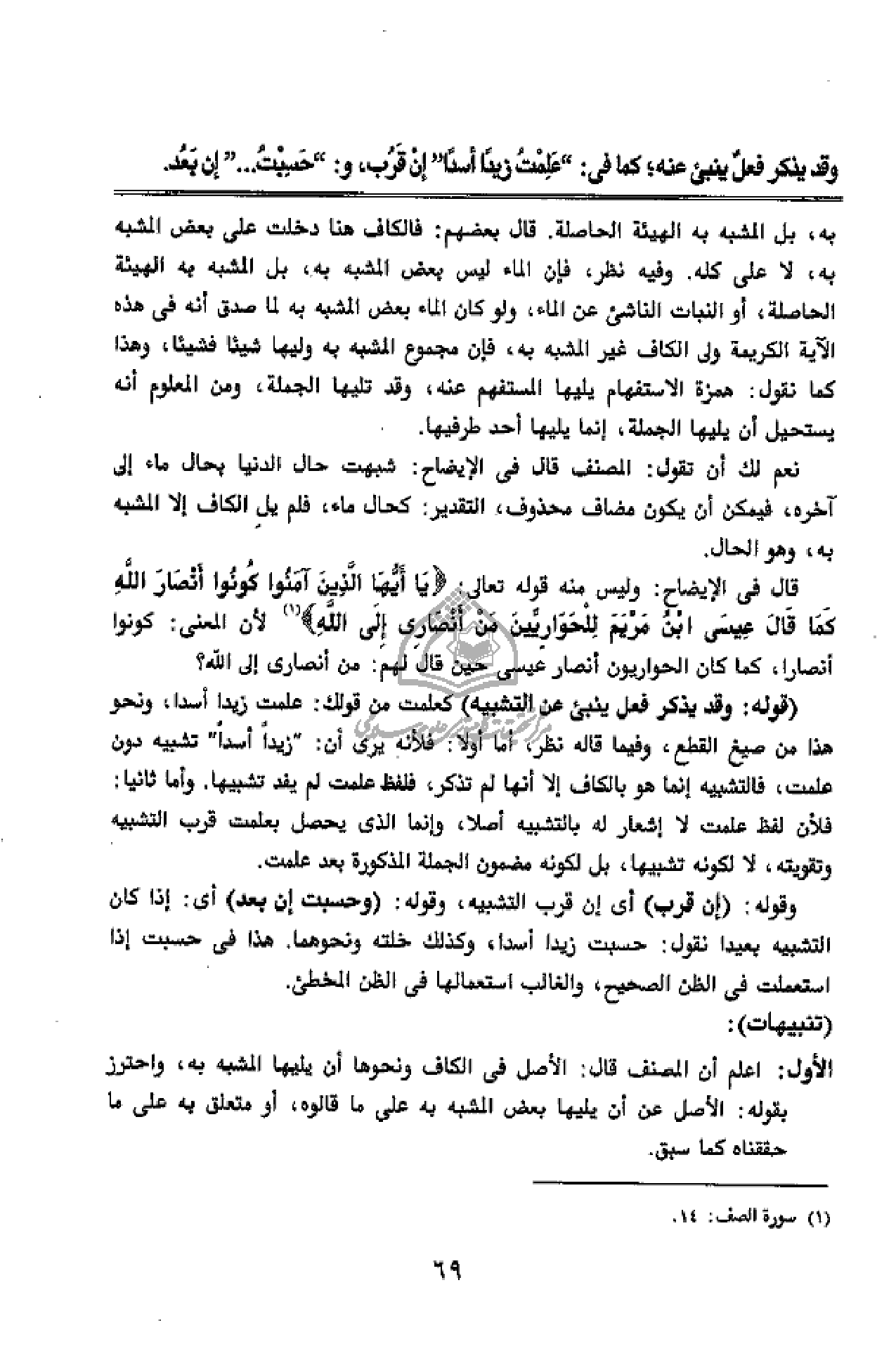 قال فى الإيضاح: وليس منه قوله تعالى: يا أَيُّهَا الَّذِينَ آمَنُوا كُونُوا أَنْصارَ اللَّهِ كَما قالَ عِيسَى ابْنُ مَرْيَمَ لِلْحَوارِيِّينَ مَنْ أَنْصارِي إِلَى اللَّهِ (¬1) لأن المعنى: كونوا أنصارا، كما كان الحواريون أنصار عيسى حين قال لهم: من أنصارى إلى الله؟