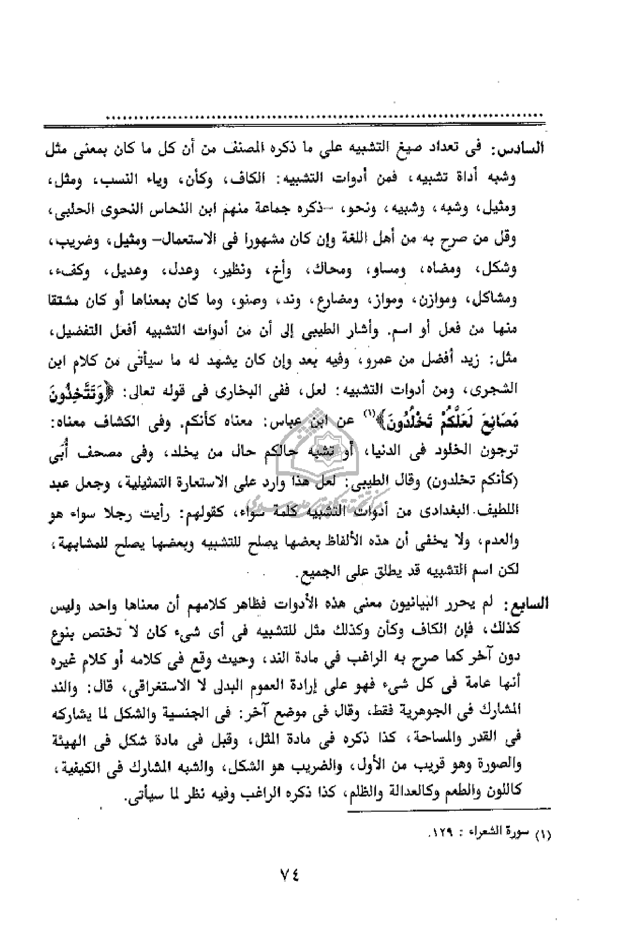 السادس: فى تعداد صيغ التشبيه على ما ذكره المصنف من أن كل ما كان بمعنى مثل وشبه أداة تشبيه، فمن أدوات التشبيه: الكاف، وكأن، وياء النسب، ومثل، ومثيل، وشبه، وشبيه، ونحو، - ذكره جماعة منهم ابن النحاس النحوى الحلبى، وقل من صرح به من أهل اللغة وإن كان مشهورا فى الاستعمال - ومثيل، وضريب، وشكل، ومضاه، ومساو، ومحاك، وأخ، ونظير، وعدل، وعديل، وكفء، ومشاكل، وموازن، ومواز، ومضارع، وند، وصنو، وما كان بمعناها أو كان مشتقا منها من فعل أو اسم. وأشار الطيبى إلى أن من أدوات التشبيه أفعل التفضيل، مثل: زيد أفضل من عمرو، وفيه بعد وإن كان يشهد له ما سيأتى من كلام ابن الشجرى، ومن أدوات التشبيه: لعل، ففى البخارى فى قوله تعالى: وَتَتَّخِذُونَ مَصانِعَ لَعَلَّكُمْ تَخْلُدُونَ (¬1) عن ابن عباس: معناه كأنكم. وفى الكشاف معناه: