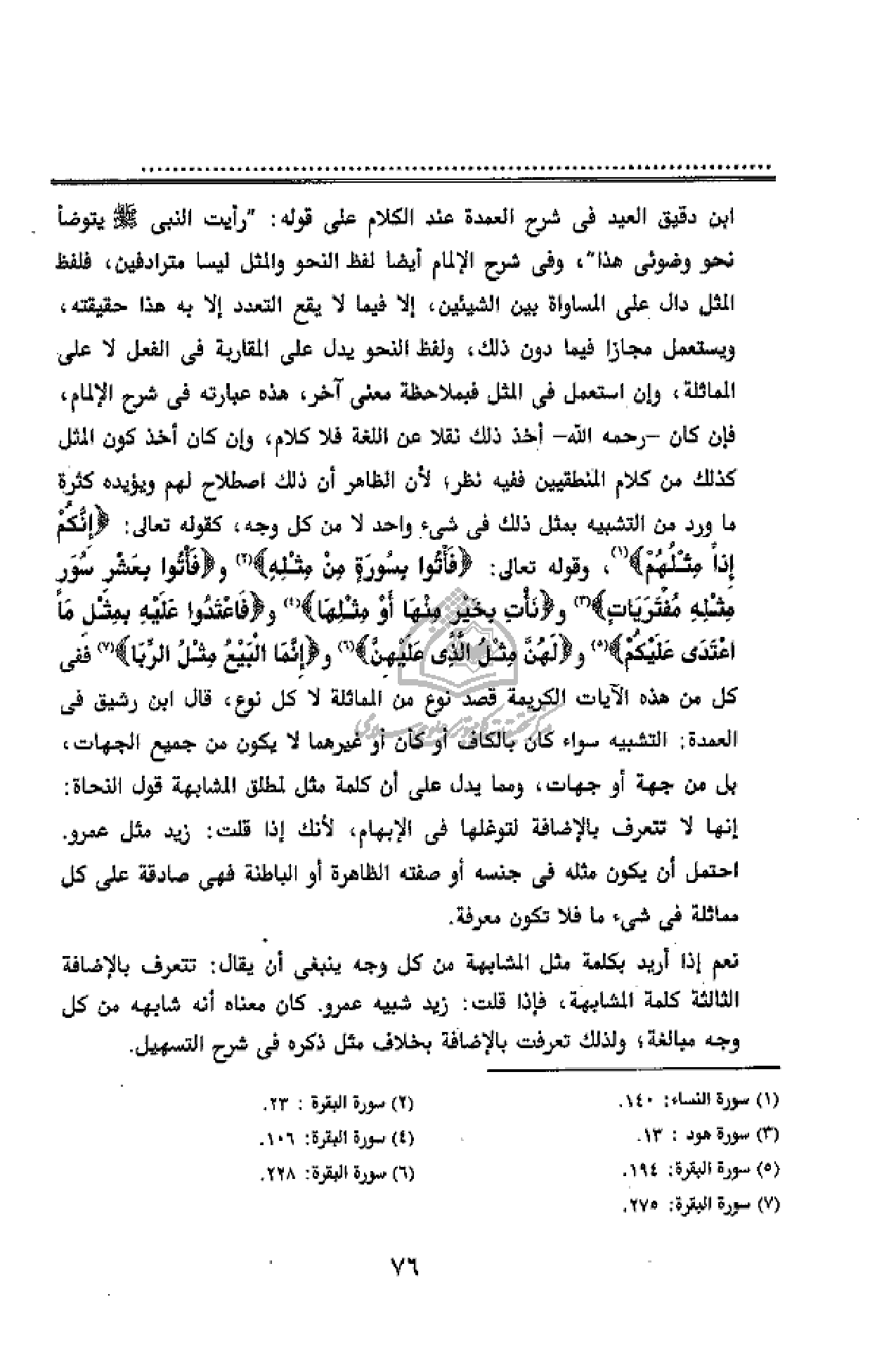ابن دقيق العيد فى شرح العمدة عند الكلام على قوله:" رأيت النبى صلّى الله عليه وسلّم يتوضأ نحو وضوئى هذا"، وفى شرح الإلمام أيضا لفظ النحو والمثل ليسا مترادفين، فلفظ المثل دال على المساواة بين الشيئين، إلا فيما لا يقع التعدد إلا به هذا حقيقته، ويستعمل مجازا فيما دون ذلك، ولفظ النحو يدل على المقاربة فى الفعل لا على المماثلة، وإن استعمل فى المثل فبملاحظة معنى آخر، هذه عبارته فى شرح الإلمام، فإن كان - رحمه الله - أخذ ذلك نقلا عن اللغة فلا كلام، وإن كان أخذ كون المثل كذلك من كلام المنطقيين ففيه نظر؛ لأن الظاهر أن ذلك اصطلاح لهم ويؤيده كثرة ما ورد من التشبيه بمثل ذلك فى شئ واحد لا من كل وجه، كقوله تعالى: إِنَّكُمْ إِذاً مِثْلُهُمْ (¬1)، وقوله تعالى: فَأْتُوا بِسُورَةٍ مِنْ مِثْلِهِ (¬2) وفَأْتُوا بِعَشْرِ سُوَرٍ مِثْلِهِ مُفْتَرَياتٍ (¬3) ونَأْتِ بِخَيْرٍ مِنْها أَوْ مِثْلِها (¬4) وفَاعْتَدُوا عَلَيْهِ بِمِثْلِ مَا اعْتَدى عَلَيْكُمْ (¬5) ولَهُنَّ مِثْلُ الَّذِي عَلَيْهِنَّ (¬6) وإِنَّمَا الْبَيْعُ مِثْلُ الرِّبا (¬7) ففى كل من هذه الآيات الكريمة قصد نوع من المماثلة لا كل نوع، قال ابن رشيق فى العمدة: التشبيه سواء كان بالكاف أو كأن أو غيرهما لا يكون من جميع الجهات، بل من جهة أو جهات، ومما يدل على أن كلمة مثل لمطلق المشابهة قول النحاة: