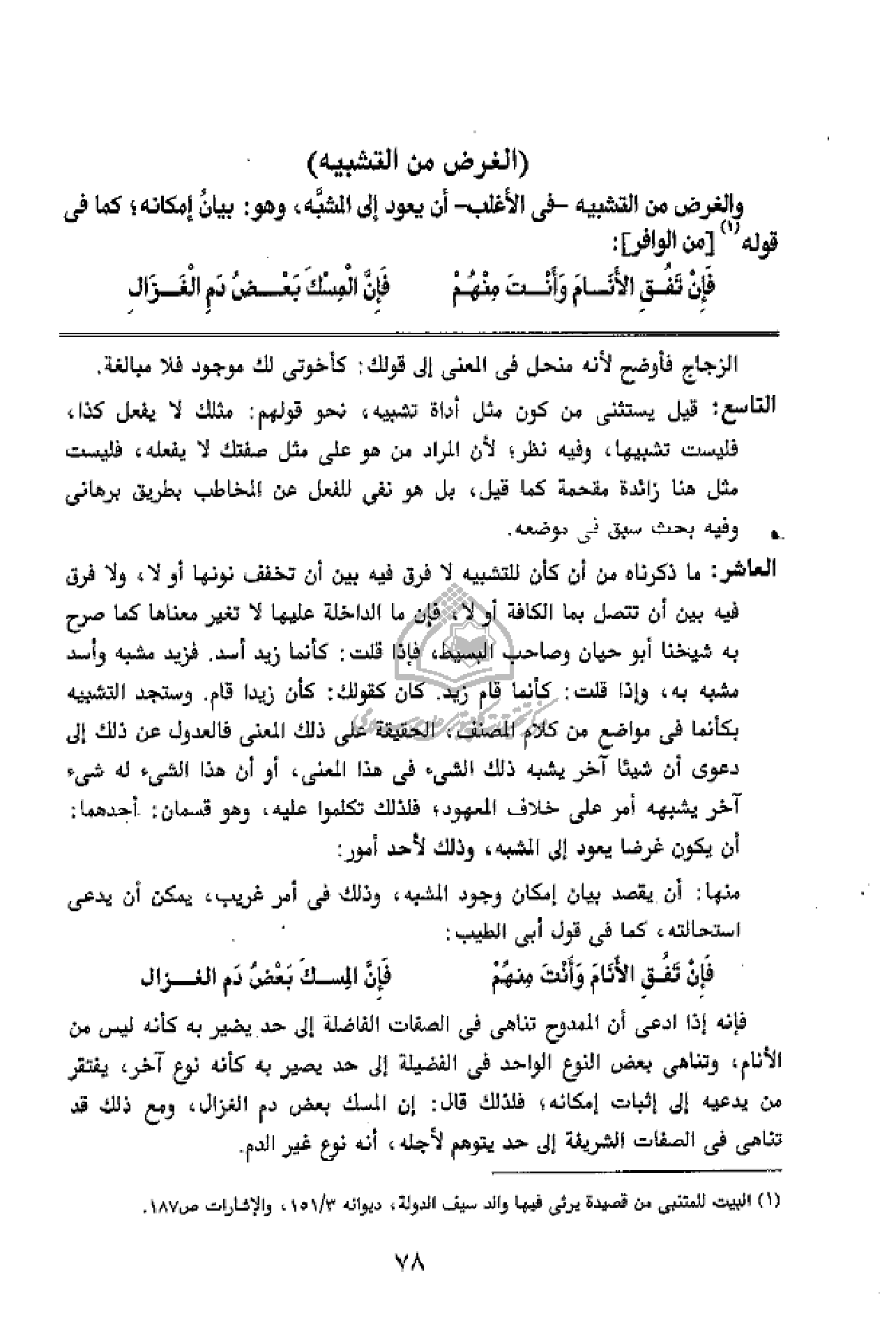 فإنه إذا ادعى أن الممدوح تناهى فى الصفات الفاضلة إلى حد يضير به كأنه ليس من الأنام، وتناهى بعض النوع الواحد فى الفضيلة إلى حد يصير به كأنه نوع آخر، يفتقر من يدعيه إلى إثبات إمكانه؛ فلذلك قال: إن المسك بعض دم الغزال، ومع ذلك قد تناهى فى الصفات الشريفة إلى حد يتوهم لأجله، أنه نوع غير الدم.