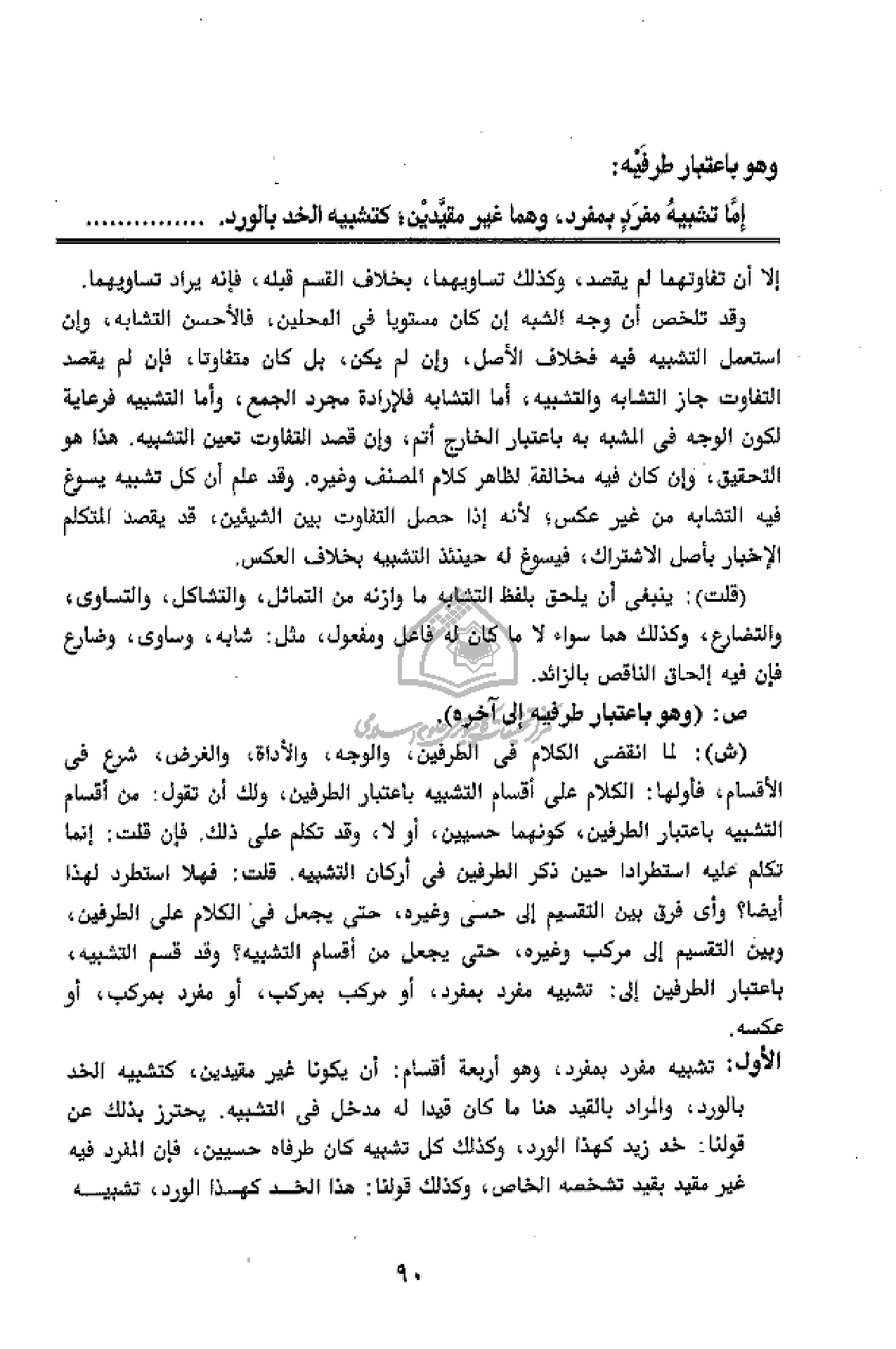 الجمع، وأما التشبيه فرعاية لكون الوجه فى المشبه به باعتبار الخارج أتم، وإن قصد التفاوت تعين التشبيه. هذا هو التحقيق، وإن كان فيه مخالفة لظاهر كلام المصنف وغيره. وقد علم أن كل تشبيه يسوغ فيه التشابه من غير عكس؛ لأنه إذا حصل التفاوت بين الشيئين، قد يقصد المتكلم الإخبار بأصل الاشتراك، فيسوغ له حينئذ التشبيه بخلاف العكس.