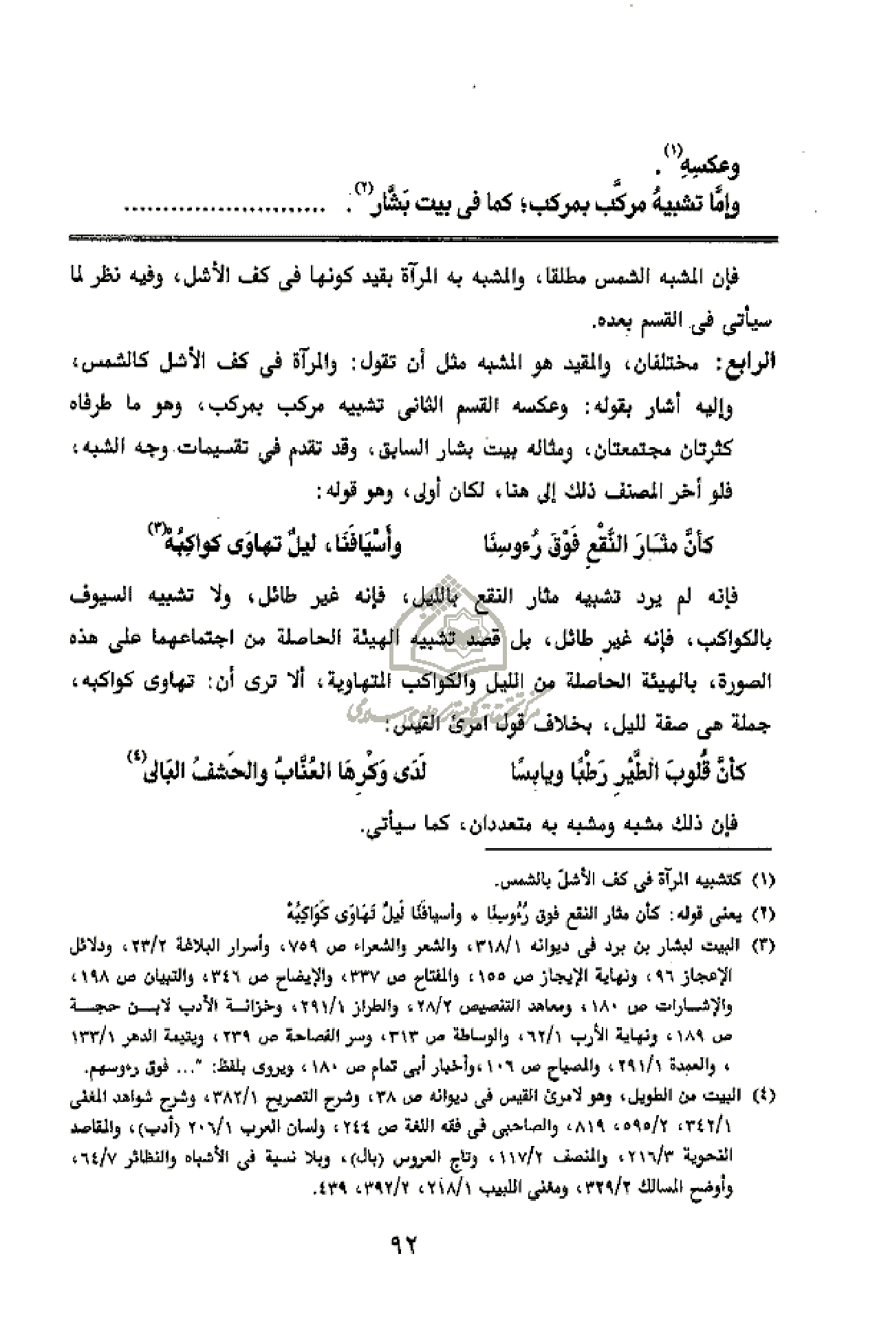 وإمّا تشبيه مركّب بمركب؛ كما فى بيت بشّار (¬2).