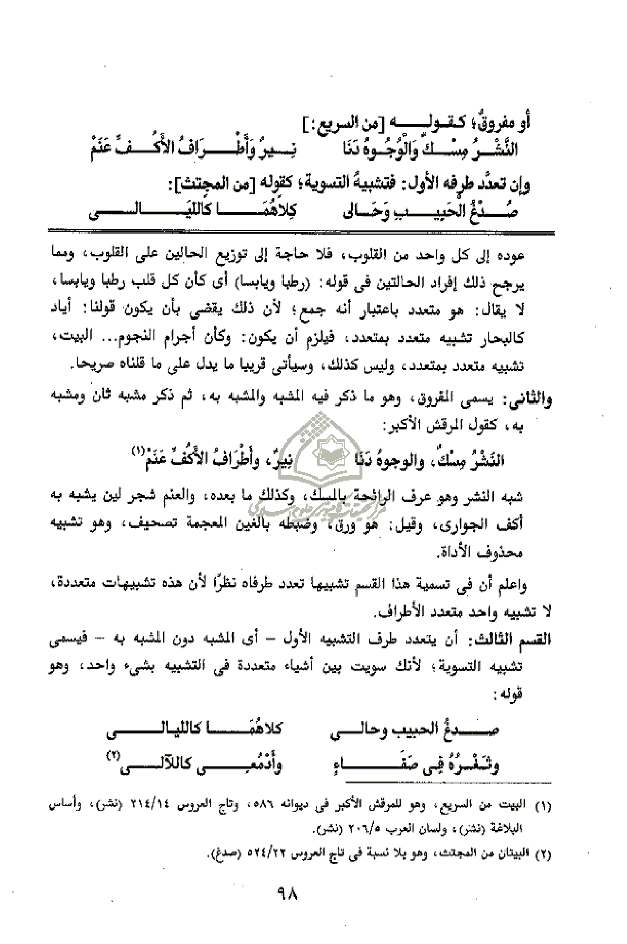 القسم الثالث: أن يتعدد طرف التشبيه الأول - أى المشبه دون المشبه به - فيسمى تشبيه التسوية؛ لأنك سويت بين أشياء متعددة فى التشبيه بشئ واحد، وهو قوله: