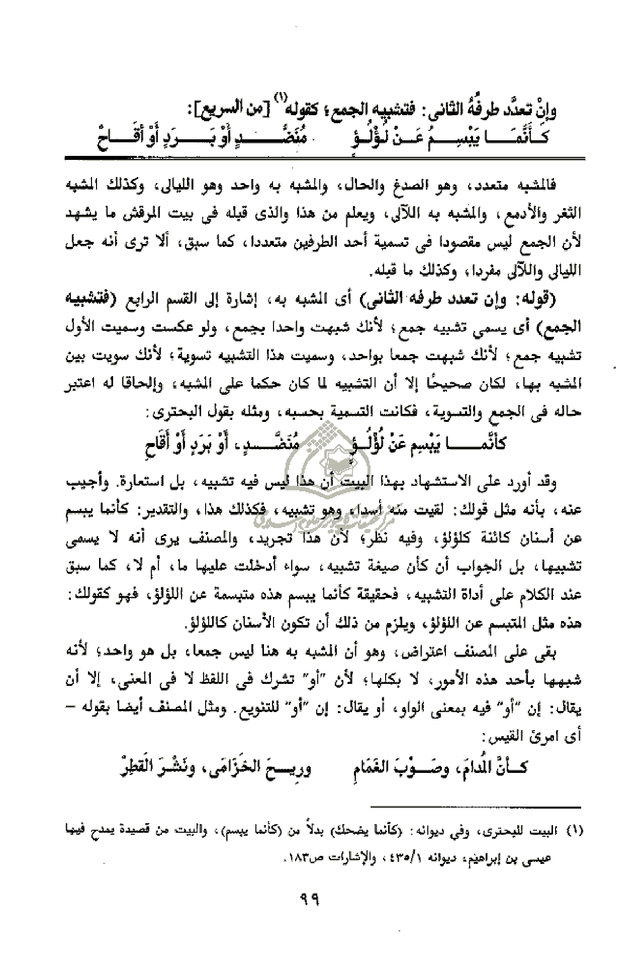 فالمشبه متعدد، وهو الصدغ والحال، والمشبه به واحد وهو الليالى، وكذلك المشبه الثغر والأدمع، والمشبه به اللآلى، ويعلم من هذا والذى قبله فى بيت المرقش ما يشهد لأن الجمع ليس مقصودا فى تسمية أحد الطرفين متعددا، كما سبق، ألا ترى أنه جعل الليالى واللآلى مفردا، وكذلك ما قبله.